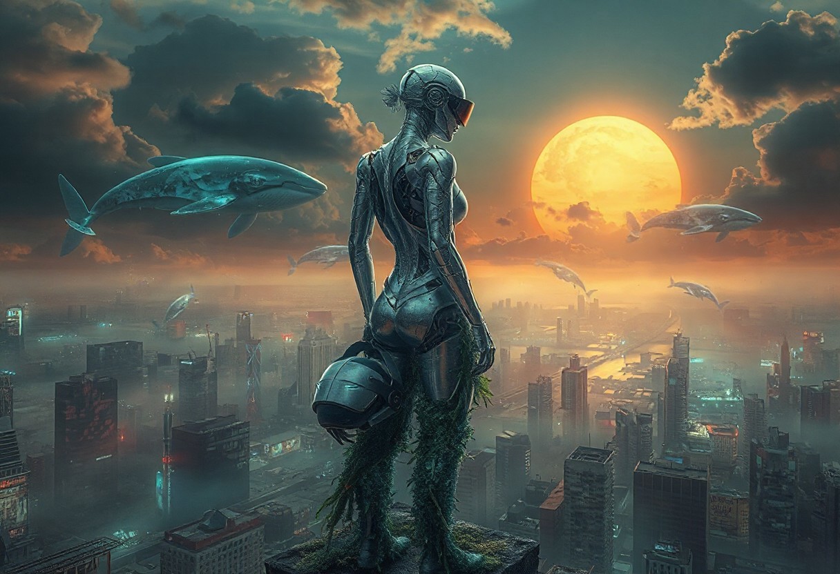 "**In the ruins of a flooded cyberpunk city, a lone AI-driven android woman stands atop a half-submerged skyscraper. Her silver body is fractured, overgrown with neon-lit algae and bioluminescent vines, reflecting the dying sun through toxic clouds. Around her, giant holographic whales swim in the polluted sky, flickering between broken advertisements and data storms. She gazes at the collapsing horizon, clutching a cracked VR helmet like a relic from a lost human civilization. Ultra-detailed, cinematic lighting, intricate textures, hyper-realistic rendering, atmosphere heavy with decay and neon glow, 8K resolution, dramatic perspective, masterpiece."