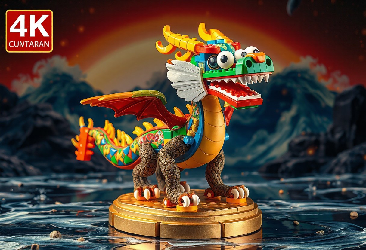 The detailed 4K image showcases a vibrant Googly-Eyes Drum Dragon, standing proudly on a Gold Moon Coin base, with its colorful body composed of blocks and pieces in bold blues, greens, reds, oranges, and yellows. The Googly-Eyes Drum Dragon, ready for action, has its arms and legs spread out, against a epic Giant Flood backdrop. The image, hyper-realistic with vivid colors and sharp lines, highlights the Googly-Eyes Drum Dragon's dynamic action pose and captivating lighting, showcasing its handcrafted precision, creative design, and joyful impact. The Googly-Eyes Drum Dragon, a celebration of color and creativity, stands in the foreground with impeccable composition, stunning the viewer with its detailed face, beautiful eyes, and powerful message.
