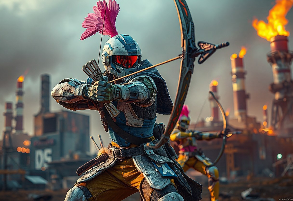 A detailed, action-details scene is depicted in 4K quality, featuring a blue and white Junk Archer center stage, wielding Phoenix Bow in a dynamic pose. Junk Archer, colored pink and yellow,Machine Conversion Factory wait in the background, boasts vibrant colors, sharp lines, and harmonious hues, all set against a Machine Conversion Factory. It's reminiscent of a matte painting with impeccable composition, creative angles, and balanced editing, conveying a powerful message through vivid emotions. The focus is on the captivating lighting, intricate details, and well-timed moment, making it a stunning and dynamic artwork, worthy of trending on ArtstationHQ or CGSociety.