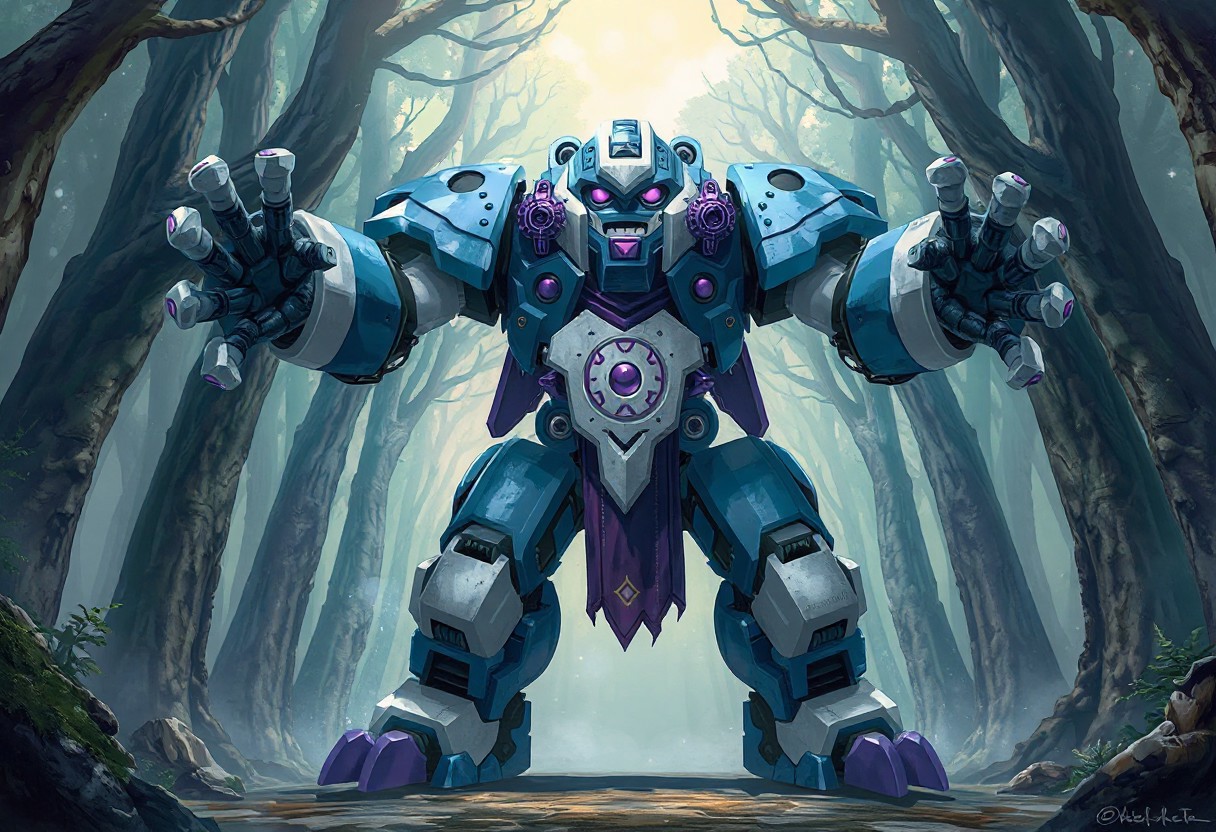 The image features a detailed, full-body view of a Gear Golem the Moving Fortress, standing in a dynamic pose with arms outstretched. The Gear Golem the Moving Fortress showcases a blue and white color scheme with purple and black accents, giving it a futuristic appearance. The background is a epic Erosion Hand Forest, allowing the rGear Golem the Moving Fortress's vibrant colors to pop. The image is expertly composed, with a focus on the Gear Golem the Moving Fortress's intricate design and lifelike details, including its expressive eyes and detailed clothing. The quality is exceptional, boasting sharp lines, harmonious colors, and vivid emotions, making it a stunning and captivating piece of art.