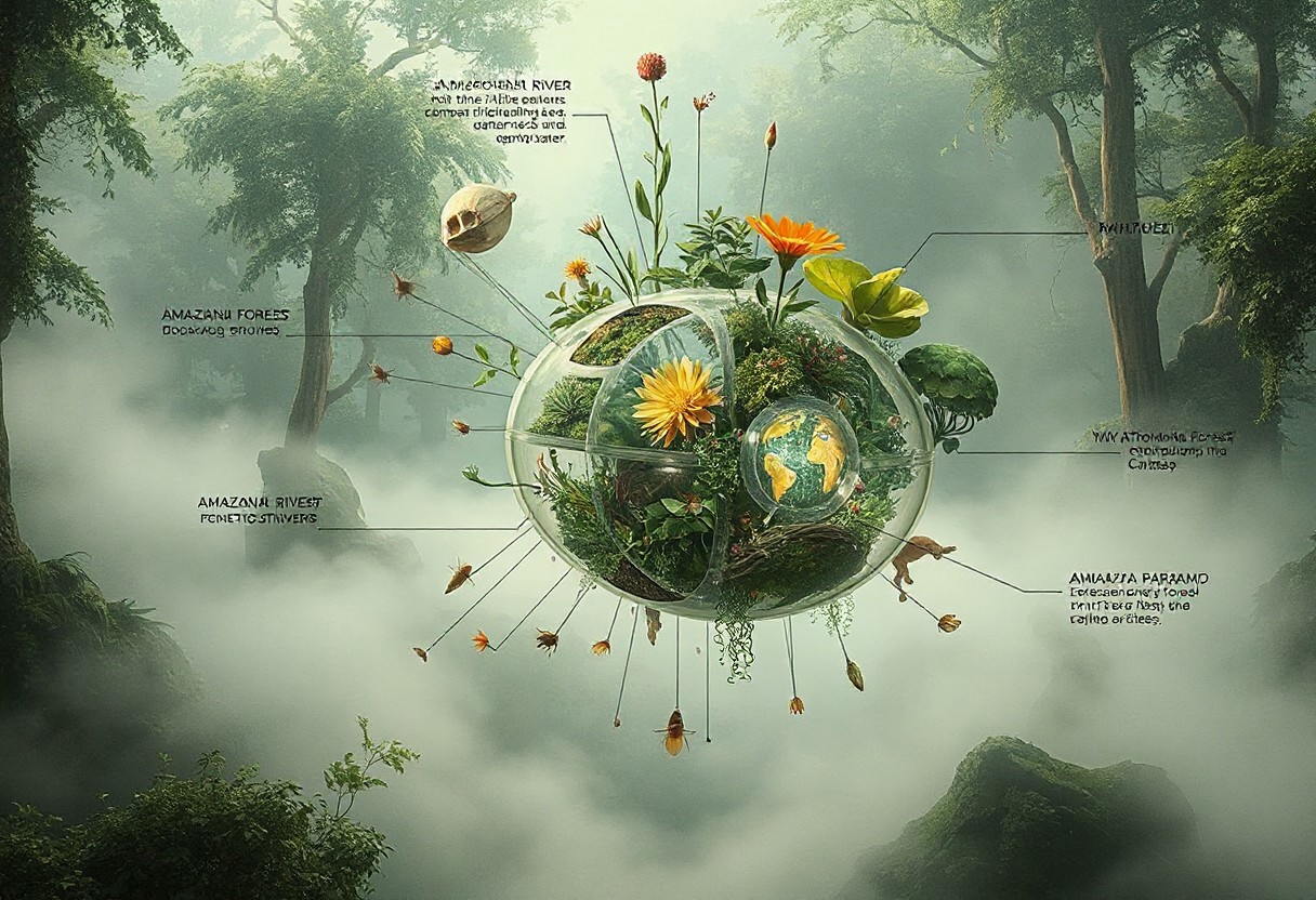 In a speculative drawing collage style, a biotech simbiogenetics bank micro ecotone is depicted as a sleek, fractal-like structure embedded within a lush, humid fog-filled environment. The compact symbiotic design, grounded in amphibious principles, features inflatable deployable structures that disperse seeds, vegetation buds, nutrients, and pollinators through various methods including ballistic, wind, and water. This intricate system is seamlessly integrated with atmospheric rivers, connecting the Amazonia Forest to the Chingaza Paramo, showcasing the interconnectedness of regional ecosystems in a highly detailed, wide background.