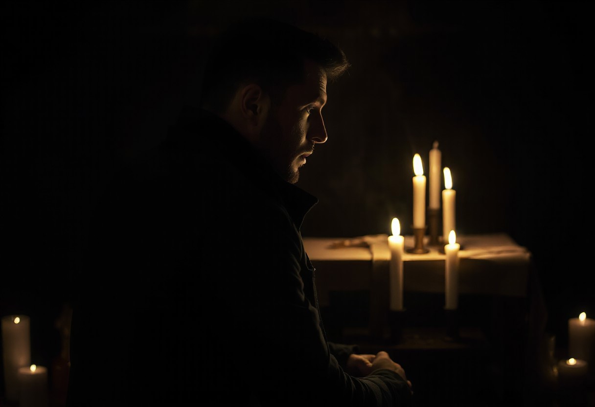 professional photo, side view photo of Caucasian man in kneeling in front of an altar with 3 lit candles on it, wearing a dark blue parka, serious face, contemplative expression, dark features, dramatic shadows, very dark and underexposed, face lit only by candles, all else dark