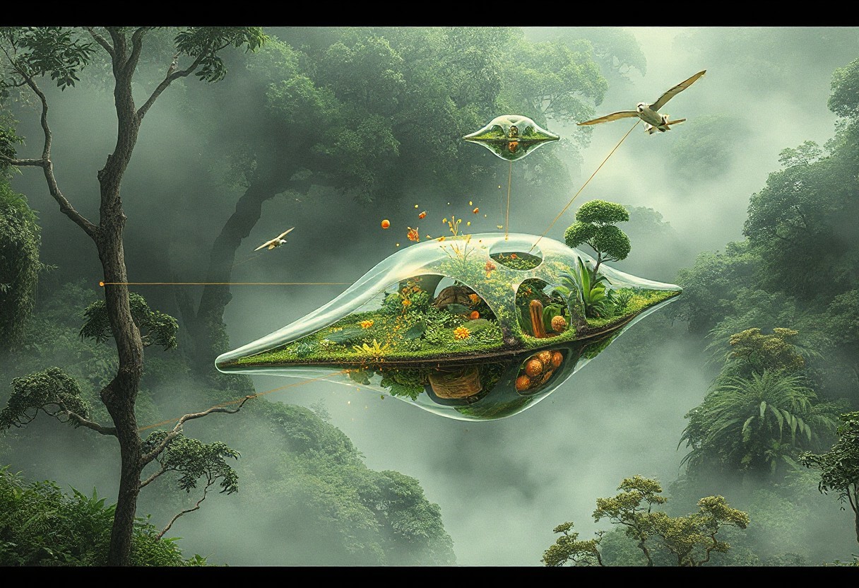 In a speculative drawing collage style, a biotech simbiogenetics bank micro ecotone is depicted as a sleek, fractal-like structure embedded within a lush, humid fog-filled environment. The compact symbiotic design, grounded in amphibious principles, features inflatable deployable structures that disperse seeds, vegetation buds, nutrients, and pollinators through various methods including ballistic, wind, and water. This intricate system is seamlessly integrated with atmospheric rivers, connecting the Amazonia Forest to the Chingaza Paramo, showcasing the interconnectedness of regional ecosystems in a highly detailed, wide background.