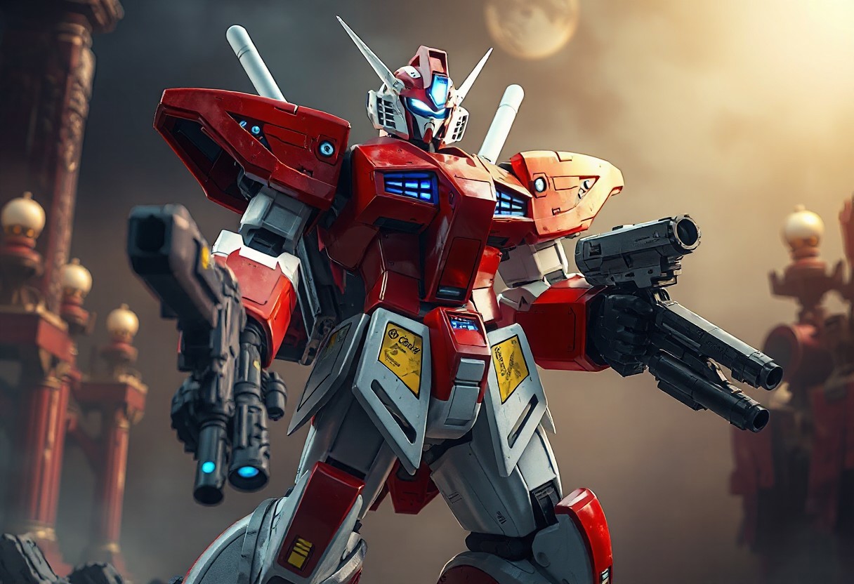 The image depicts a detailed Dark King of the Abyss robot, standing with a readiness posture, against an Altar of Restoration background. The robot, primarily red and white, features blue and yellow accents, giving a lively touch. The body is strikingly red with white and blue accents highlighting the features, while the head is a blend of red and white with a blue visor. Holding large and small guns, the robot's dynamic pose exudes a powerful message, ready for action. The image captures a compelling story, with exceptional 4K quality, vivid emotions, and beautiful detailed eyes. Trending on Artstation and 8k, the artwork is a front and backlit masterpiece.