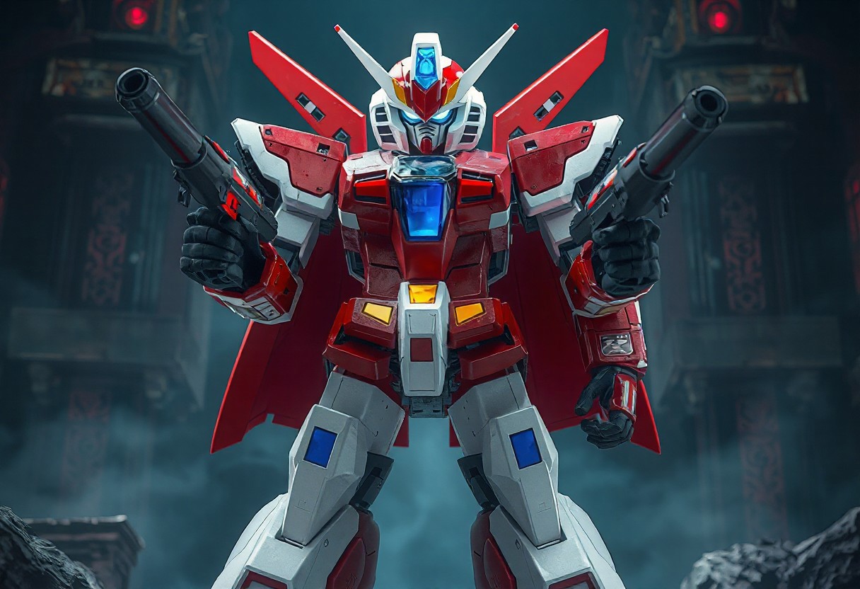 The image depicts a detailed Dark King of the Abyss robot, standing with a readiness posture, against an Altar of Restoration background. The robot, primarily red and white, features blue and yellow accents, giving a lively touch. The body is strikingly red with white and blue accents highlighting the features, while the head is a blend of red and white with a blue visor. Holding large and small guns, the robot's dynamic pose exudes a powerful message, ready for action. The image captures a compelling story, with exceptional 4K quality, vivid emotions, and beautiful detailed eyes. Trending on Artstation and 8k, the artwork is a front and backlit masterpiece.