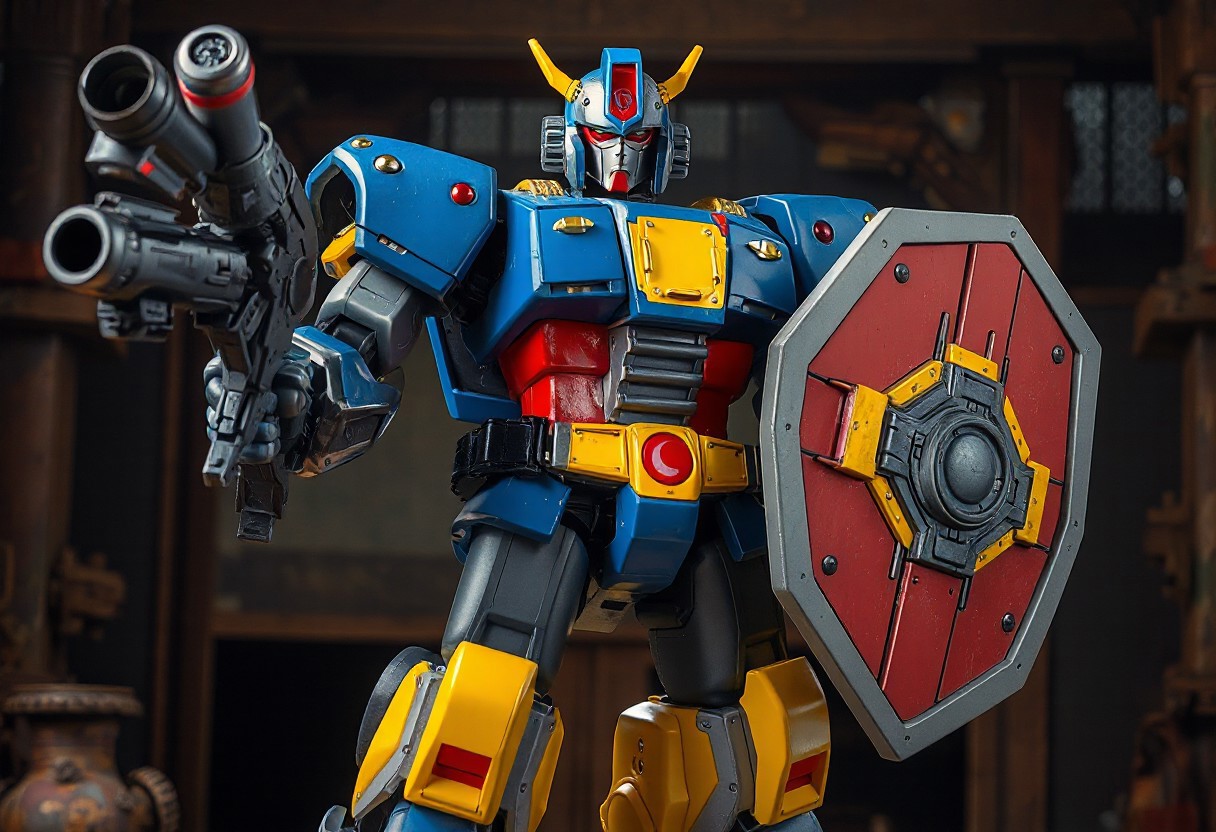 The Coach Captain Bearman robot stands proudly against an Ancient Gear Factory backdrop, exuding an aura of readiness. This blue, gray, and yellow robot, with red and gold accents, holds a large gun in its right hand and a shield in its left, symbolizing protection. The dynamic action pose, sharp lines, and vibrant colors showcase the robot's intricate details, from its super-detailed face and clothes to its handcrafted precision. This 4K image, with its captivating lighting and balanced editing, captures the robot's lifelike details and vivid emotions, making it a stunning piece of art.
