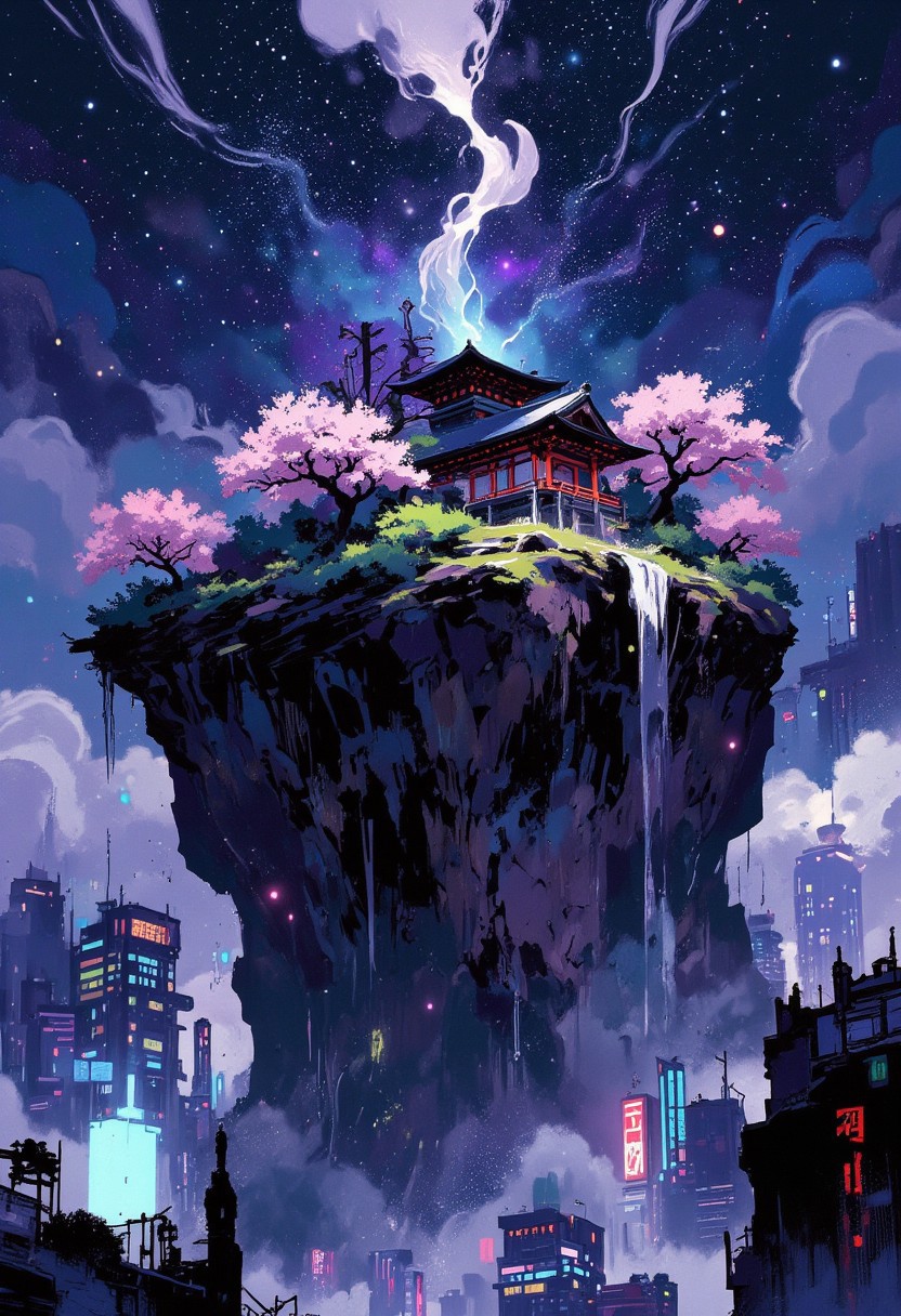 aidmafluxpro1.1, abstract style of Bruce Holwerda, soft lighting with dynamic highlights, A surreal view of a futuristic nighttime metropolis. In the middle of the city there is a high table mountain with steep cliffs. On the plateau of the mountain there is a cozy Japanese garden with an ancient Japanese temple, red gate, cherry blossoms and green bushes. The mountain is surrounded on all sides by cyberpunk skyscrapers with neon signs in all colors of the rainbow. The temple on the mountain is illuminated to stand out against the night sky. The garden seems ghostly and mystical. There are stone steps carved into the rock. The sky is studded with stars and swirling galaxies. A fantastic landscape. i11ustmin Illustration