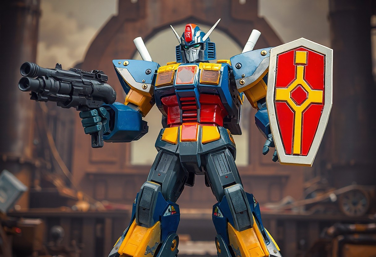 The Coach Captain Bearman robot stands proudly against an Ancient Gear Factory backdrop, exuding an aura of readiness. This blue, gray, and yellow robot, with red and gold accents, holds a large gun in its right hand and a shield in its left, symbolizing protection. The dynamic action pose, sharp lines, and vibrant colors showcase the robot's intricate details, from its super-detailed face and clothes to its handcrafted precision. This 4K image, with its captivating lighting and balanced editing, captures the robot's lifelike details and vivid emotions, making it a stunning piece of art.