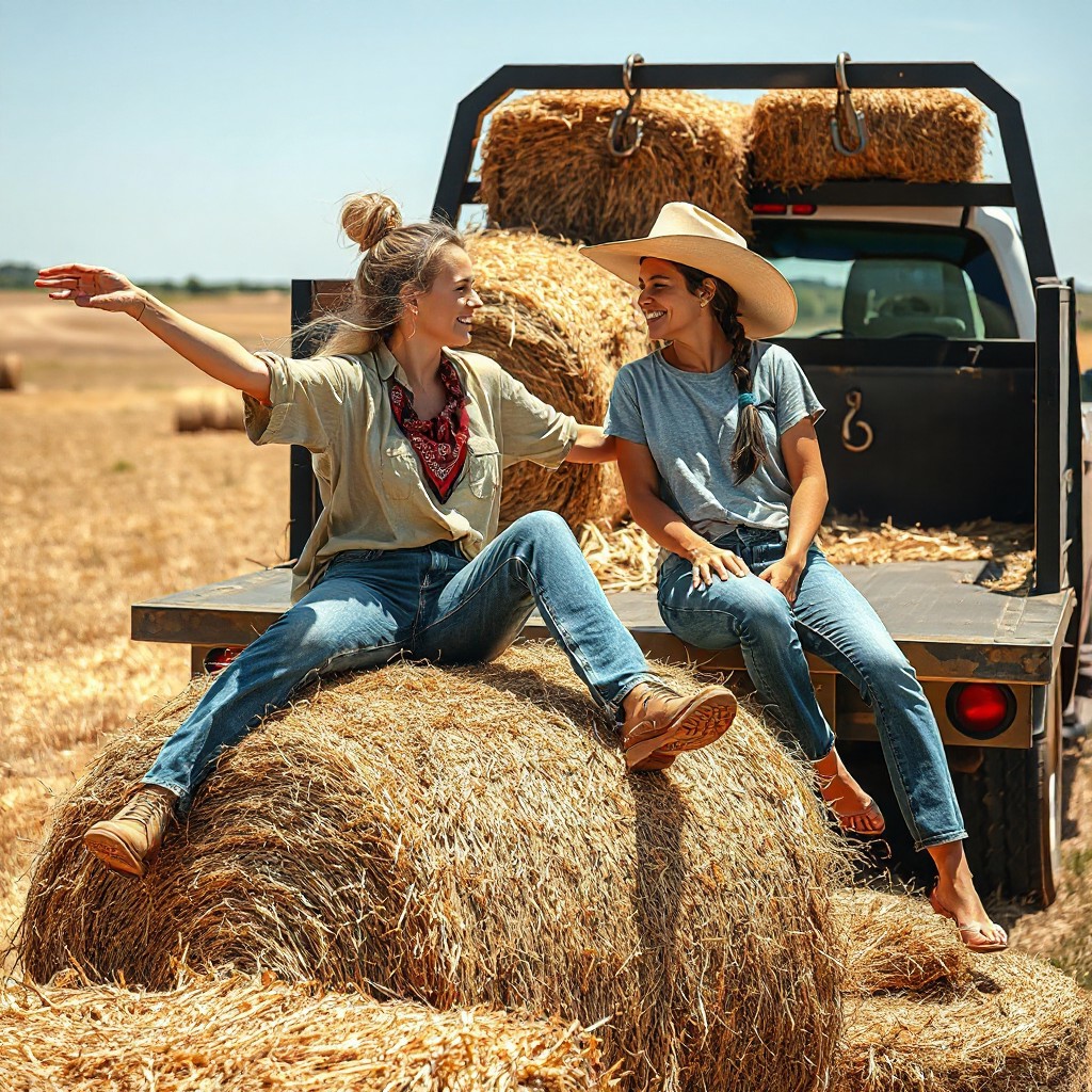 two lovely women finished loading bales of hay on a flatbed truck. A beautiful blonde, strands of hair loose from bun, sitting on a bale of hay, reclining back on another bale, legs spread, sweaty face, reaching out an arm in invitation to approach and sit next to her, wearing jeans and loosened shirt and bandana, relaxed happy, tired. A gorgeous brunette, braided hair and cowboy hat, jeans and t-shirt, sweaty, looking lovingly at the blonde, starting to sit down on a bale of hay next to the blonde. Sunny day, field cleaned of bales of hay, stevedore's hooks on bales nearby women.