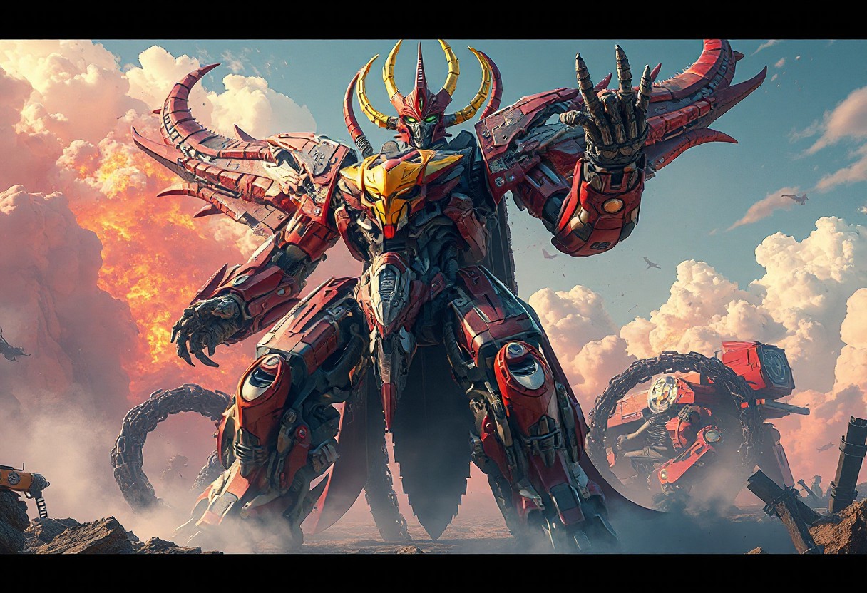 epic details, full body"Create a high-quality, dynamic 4K artwork of a Chaos King Archfiend robot on a Gravity Collapse, a full body portrait of a zentaur, and a full body red mech in the style of guo hua. Include massive construction machines and an epic, intricate abstract upper body. Merge Akira and Bumblebee in a transforming figurine in the background. Implement vivid colors, stunning details, and a harmonious composition. Aim for a trending, award-winning piece on Artstation, inspired by Makoto Shinkai, Stanley Artgerm Lau, and other top artists."