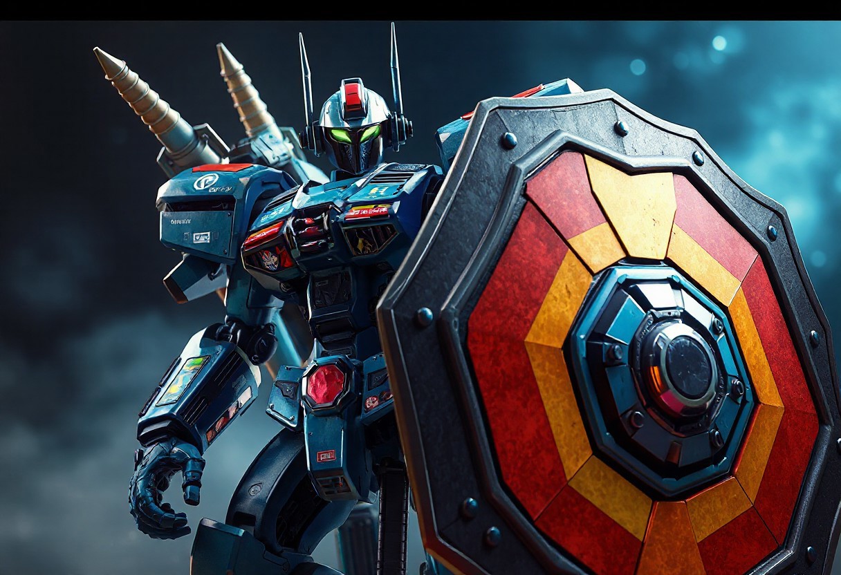 A Dark Eradicator Warlock robot, equipped with a Mad Sword Beast and a Magical Trick Mirror shield, stands ready for action against a Light to the Depths backdrop. The robot, blue and adorned with colorful stickers, holds a large, multi-colored shield. The high-res image showcases the robot in intricate detail, from its lifelike facial features to its sharply designed clothes. The dynamic action pose and captivating lighting create a sense of movement and excitement, while the vibrant colors and harmonious design contribute to the overall narrative. Trending on Artstation.