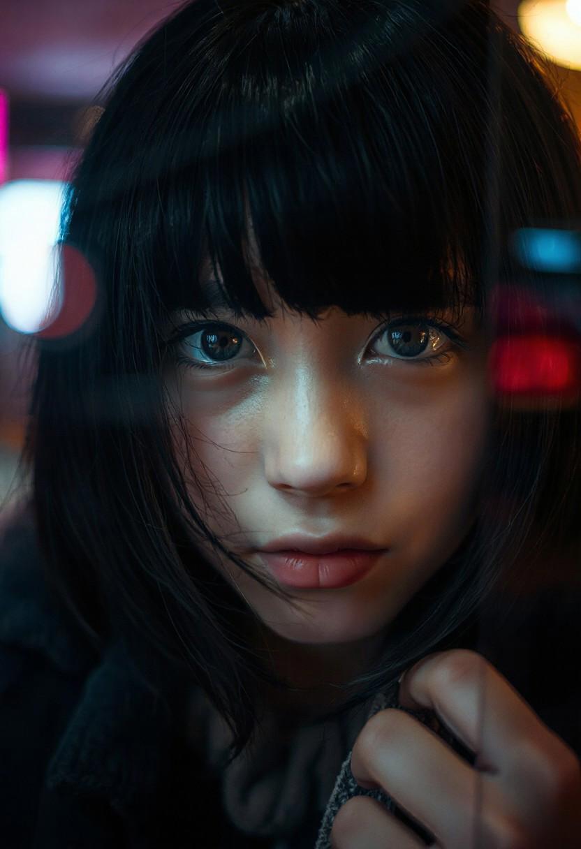 RAW photo, aperture f/1.8,macro close-up portrait shot through a reflecting plexiglass, caucasian girl with a fuzzy, black bob looks straight into the camera with a curious look. Lighting: colored light accents Mood: Aesthetic composure, private moment. Quality: hyper-realisitic, hyper-detailed, detailed foreground, masterpiece, award winning photography