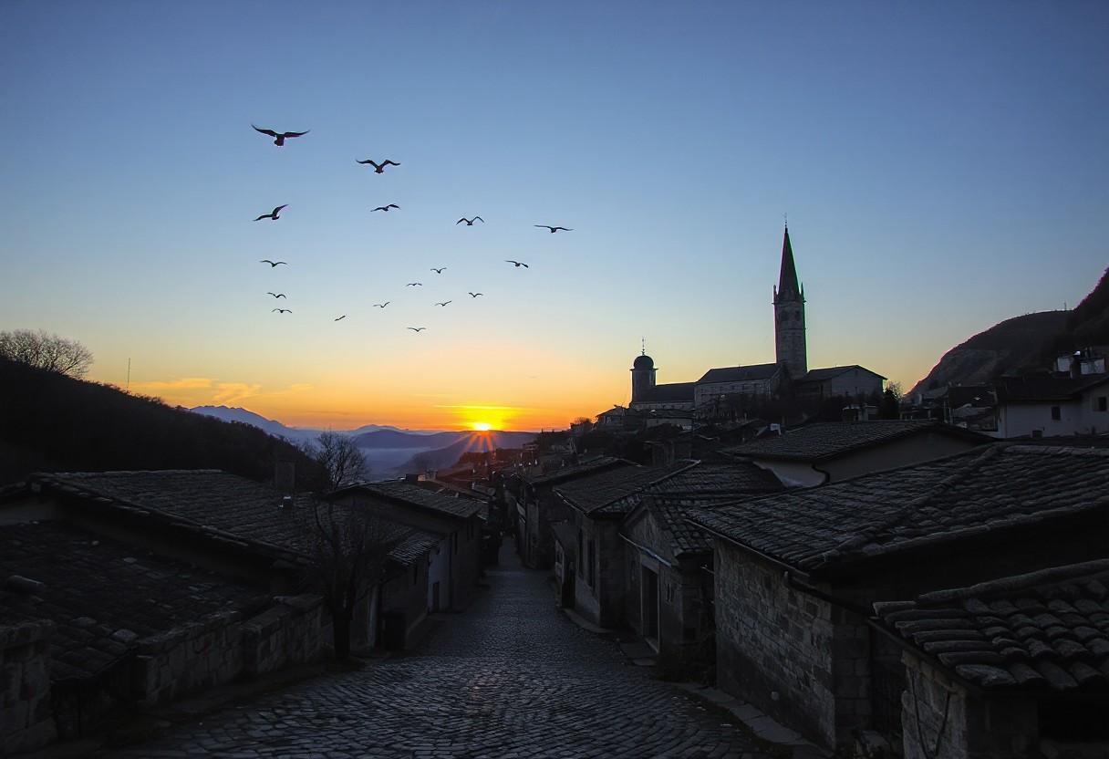 professional photo, photo of a distant old European mountain village with medieval cobblestone streets and an old cathedral, a small flock of birds fly over the town mere dots in the distance, at twilight, sun glows just over the horizon