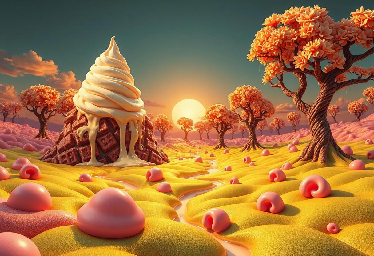A wild, surreal fantasy landscape entirely composed of mouthwatering desserts, yet infused with a bizarre sensuality. Two towering scoops of ice cream, with creamy peaks melting under the golden glow of an eternal sunset, drip rivers of creamy milk cascading into pools below. The ground is covered in vibrant, glistening green velvet fields, impossibly soft and shimmering as if woven from edible silk. Jiggly, butt-shaped jello slimes in shades of pink, peach, and caramel bounce playfully across the terrain, their perfectly rounded forms rippling with every movement. Towering chocolate waffle trees stretch toward the candy-colored sky, their twisted branches heavy with lush, nectar-dripping flowers resembling intimate, fleshy folds, exuding the thick, golden sweetness of honey. The air is thick with an intoxicating blend of warm vanilla, rich cocoa, and fermented fruit, an overwhelming sensory overload. Hyper-realistic yet dreamlike, ultra-detailed 8K, overflowing with indulgent textures, erotic surrealism, and chaotic divine beauty. The key elements in the image are draw along a Fibonacci spiral. High Depth of field, dynamic reflections, super aesthetic, masterpiece, NSFW.