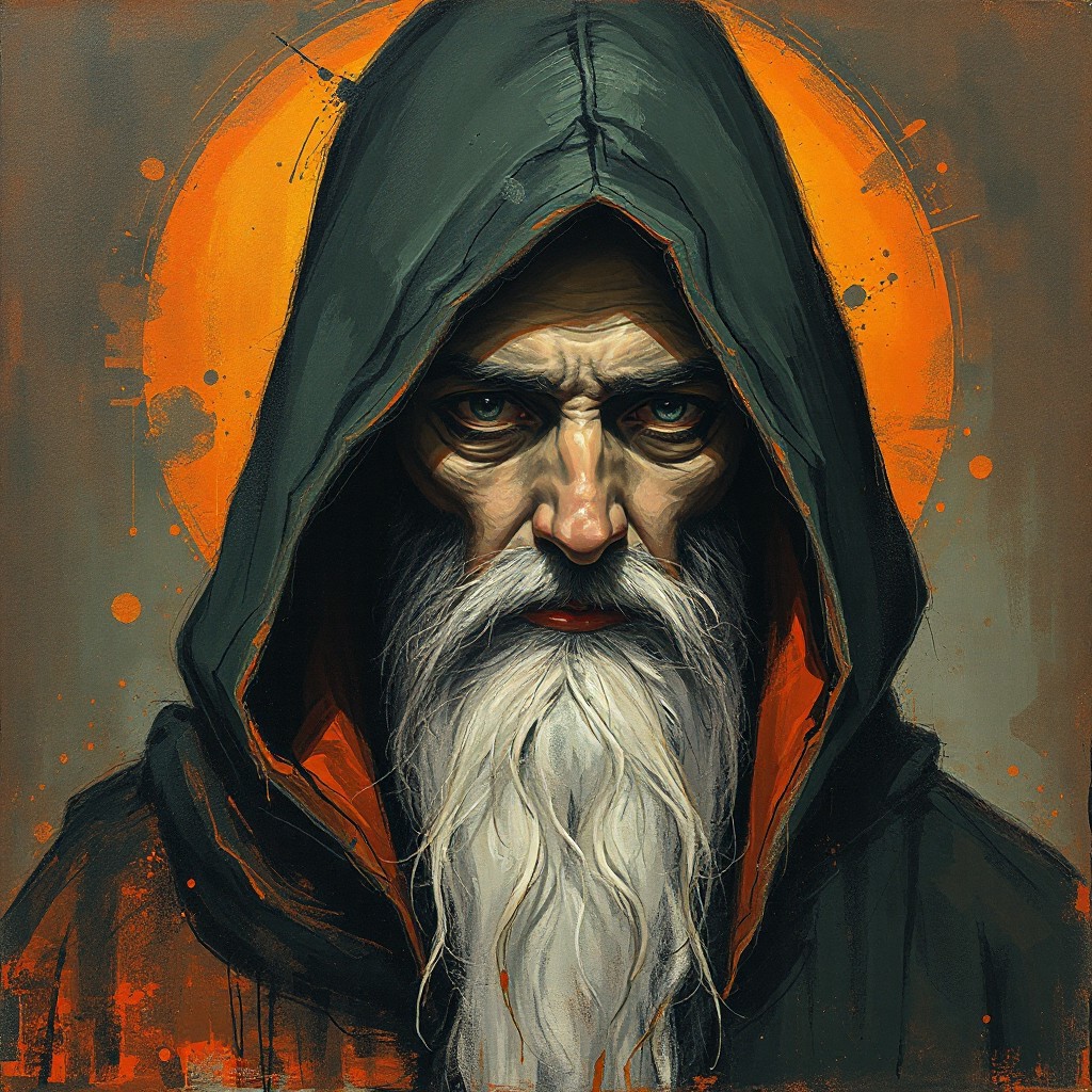 painting of a hooded wizard, rendered with bold, expressive smudges and unfinished strokes, Art nouveau style
