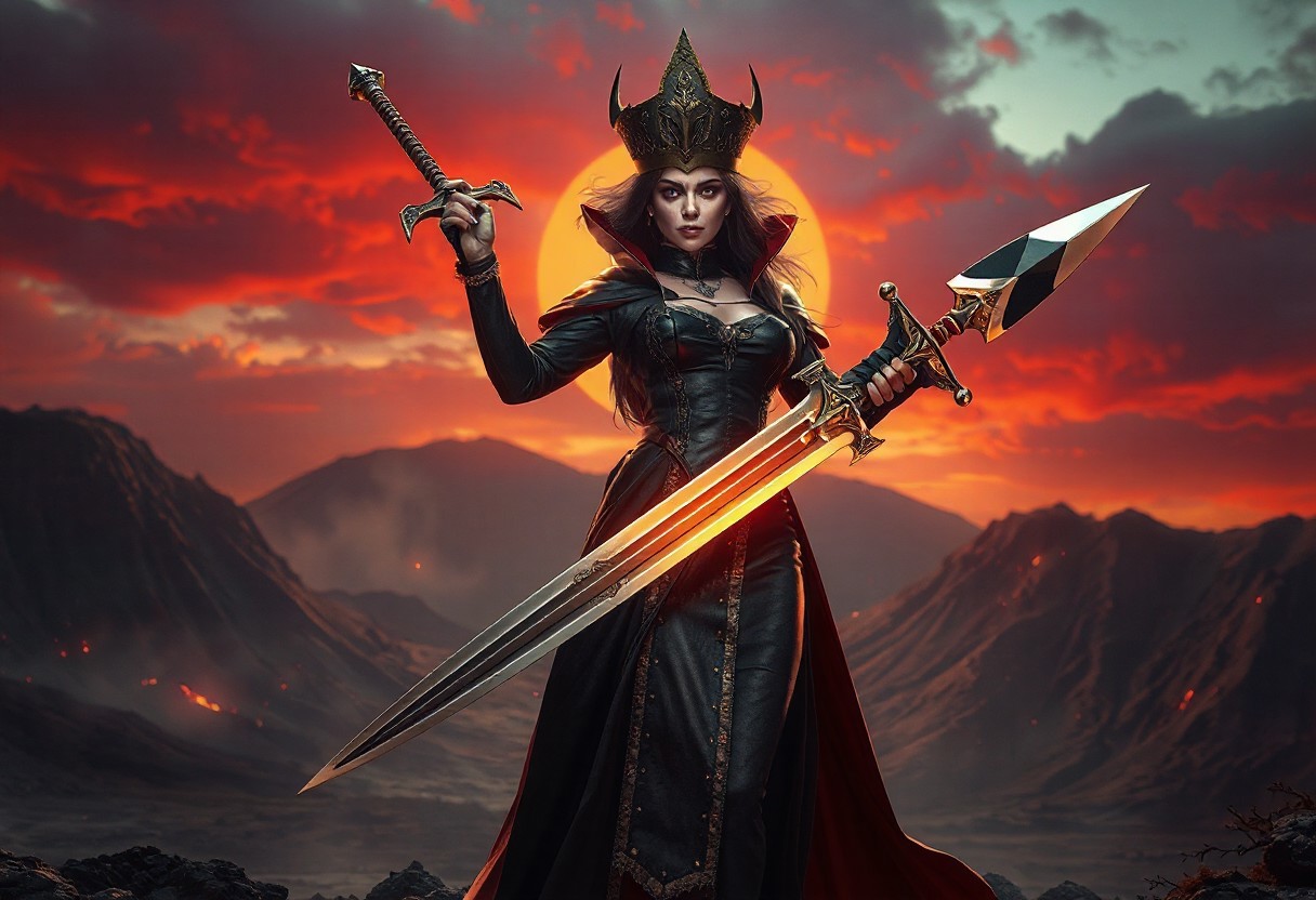 A full-body, voluptuous vampire lady, dressed as a cleric and holding a celestial sword with silver and gold trim, stands in an authoritative pose on a Dormant Volcano background. She is set against the backdrop of Gustavo Fring and Adeptus Astartes in an epic splashscreen character art with a war cry. The scene embodies academism style with vivid emotions, cinematic lighting, and intricate details. It is rendered in 8K resolution using Octane and Unreal Engine 5, showcasing stunning colors, harmonious composition, and a captivating focus on the character. The artwork is trending on ArtStation and CG Society, reflecting a powerful message and the golden ratio. The vampire is from the Catholicpunk universe, echoing Dune (2021) aesthetics and dynamic action. The detail-oriented artwork boasts impeccable editing, intentional focus, and a well-timed moment, making it a standout piece in the genre.