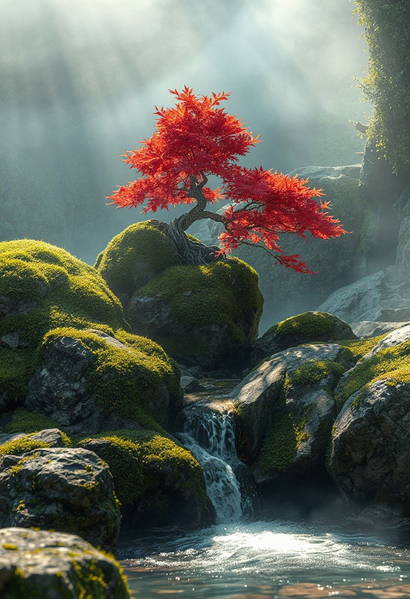 "A serene Terraquim-style landscape, featuring a small waterfall cascading down rocky outcrops covered in lush green moss, surrounded by a misty atmosphere, with a vibrant red-leaved Japanese maple bonsai tree prominently placed on one of the rocks, soft sunlight filtering through the scene, highly detailed, cinematic lighting, ethereal and dreamy aesthetic, 4K resolution, hyper-realistic textures, in the style of DreamShaper"