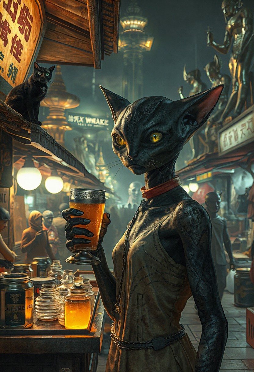 Setting is an extraterrestrial alien street market at night in a city of an extremely advanced extraterrestrial civilization, ((all writing is in an alien script)), ((all lighting is exotic and of an extremely advanced technology., the market is comprised of street vendors selling food, exotic technological wonders, and alien clothing. The extraterrestrial beings have a variety of appearances (some are human-like, others are insectoid or feline or canine or reptilian, they are wearing a variety of clothing are walking through the street market shopping and eating, A black cat with red collar sits on a nearby wooden roof at a market kiosk. Behind the a kiosk counter are containers of exotic goods, (((a beautiful alien anthropogenic cat-like being, 24 years old, is standing in the foreground facing the viewer with a glowing metal goblet of beer in her paw/hand. Her eyes are beautiful and focused on the viewer, she has an expression of interested curiosity))), the being is dressed in exotic style clothing of a completely exotic aesthetic. Enormous metallic statues and temples are visible in the background and around the scene and smaller statues are prevalent in the market, Epic image that elicits a feeling of wonder and awe, (((many types of aliens are walking around the market)))