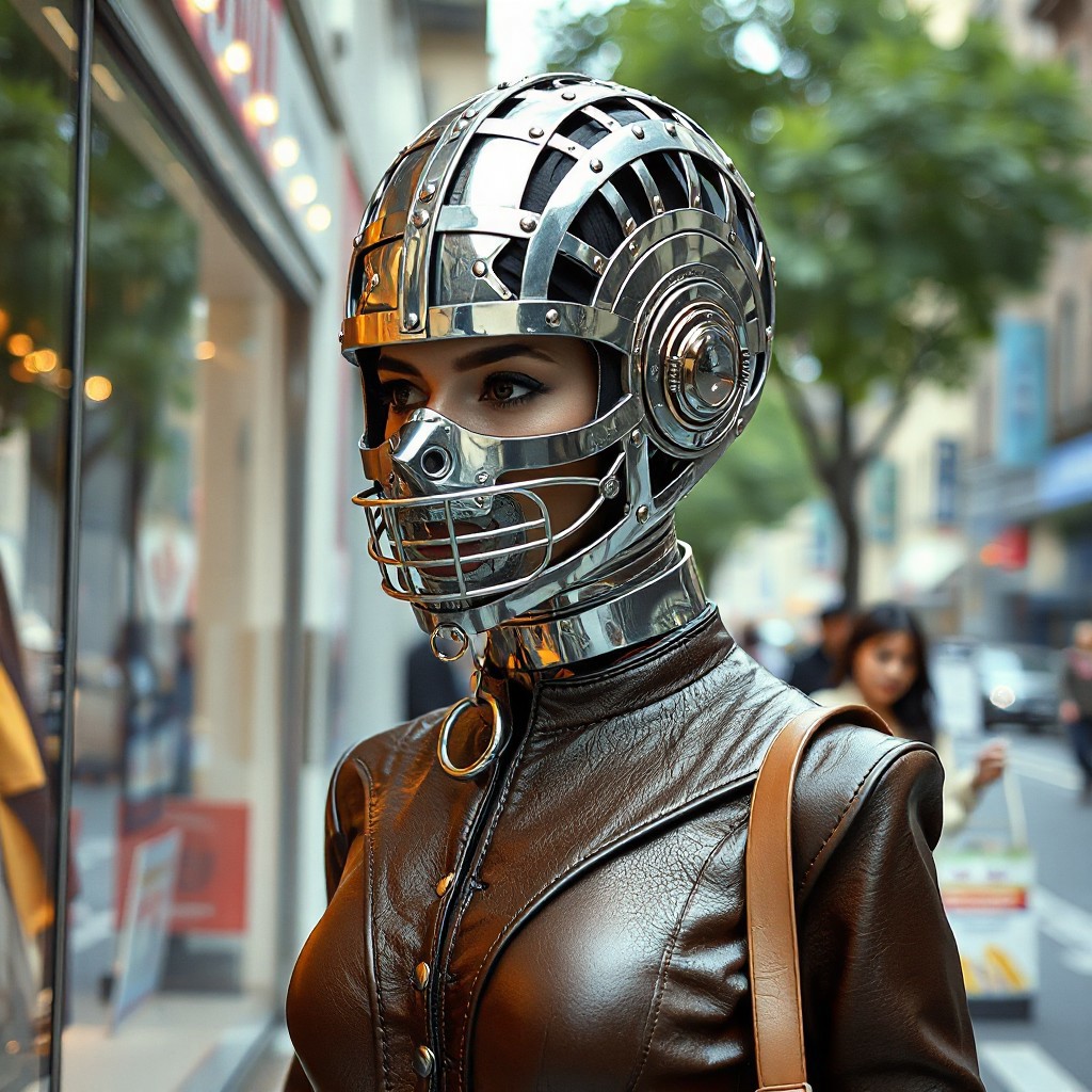 Full height view, a woman is wearing a close-fitting full face stainless steel head casing in the form of a female head made from an open framework of criss-cross strips of polished stainless steel riveted together, it fits closely to her head and neck and shoulders like a second skin fully enclosing head and face and neck and shoulders, the head casing, the head casing has two ornate eye holes and the steel neck casing is very elongated and there is a stainless steel grill muzzle covering her mouth (and she has a steel tethering ring through her nose:1.8), she is dressed in an elegant leather pencil skirt with high heels and a silk blouse and a fitted and tightly corseted jacket, she has a tiny and tight-laced waist, she is window-shopping on a busy street