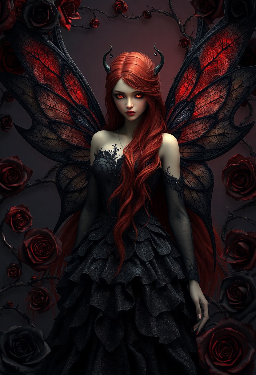 A photorealistic 3D artwork of a stunning fairy with a crimson and black theme inspired by black roses and dark magic. Her long, flowing hair, a deep, rich crimson, cascades down her back like rivulets of blood. Her eyes, a piercing, glowing crimson, hold an intense, almost hypnotic gaze. Her wings, delicate yet powerful, are crafted from a shadowy, translucent black material, veined with crimson lines resembling the thorns of a rose. She is adorned in a gown of shimmering, layered black fabric, reminiscent of unfolding black rose petals, giving her a darkly elegant and regal presence. The scene is enveloped in swirling fractal patterns inspired by thorny vines and the spiraling centers of black roses, creating a dramatic and mysterious atmosphere. The overall composition is rich in contrast and texture, with a gothic, almost surreal quality that brings the fairy and her surroundings to life in a dramatic interplay of crimson and black