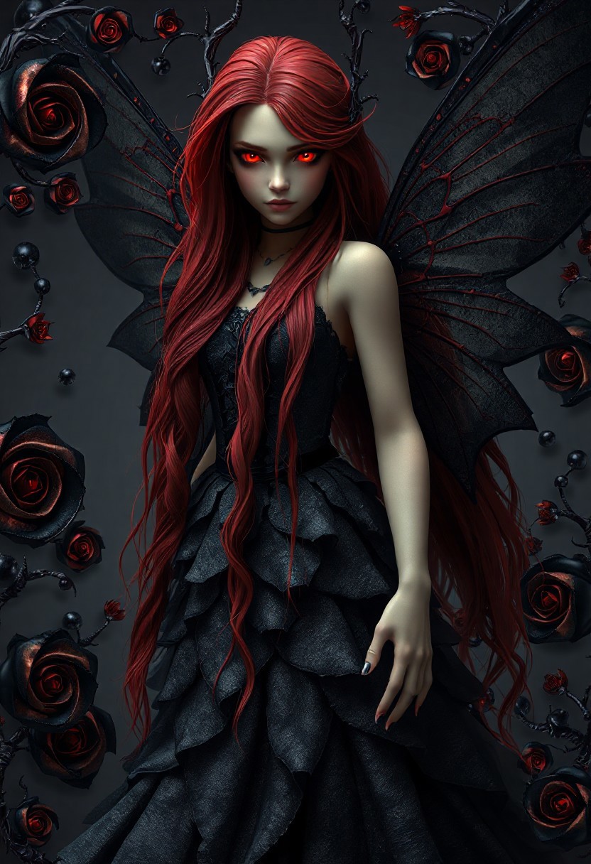 A photorealistic 3D artwork of a stunning fairy with a crimson and black theme inspired by black roses and dark magic. Her long, flowing hair, a deep, rich crimson, cascades down her back like rivulets of blood. Her eyes, a piercing, glowing crimson, hold an intense, almost hypnotic gaze. Her wings, delicate yet powerful, are crafted from a shadowy, translucent black material, veined with crimson lines resembling the thorns of a rose. She is adorned in a gown of shimmering, layered black fabric, reminiscent of unfolding black rose petals, giving her a darkly elegant and regal presence. The scene is enveloped in swirling fractal patterns inspired by thorny vines and the spiraling centers of black roses, creating a dramatic and mysterious atmosphere. The overall composition is rich in contrast and texture, with a gothic, almost surreal quality that brings the fairy and her surroundings to life in a dramatic interplay of crimson and black