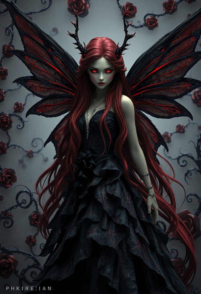 A photorealistic 3D artwork of a stunning fairy with a crimson and black theme inspired by black roses and dark magic. Her long, flowing hair, a deep, rich crimson, cascades down her back like rivulets of blood. Her eyes, a piercing, glowing crimson, hold an intense, almost hypnotic gaze. Her wings, delicate yet powerful, are crafted from a shadowy, translucent black material, veined with crimson lines resembling the thorns of a rose. She is adorned in a gown of shimmering, layered black fabric, reminiscent of unfolding black rose petals, giving her a darkly elegant and regal presence. The scene is enveloped in swirling fractal patterns inspired by thorny vines and the spiraling centers of black roses, creating a dramatic and mysterious atmosphere. The overall composition is rich in contrast and texture, with a gothic, almost surreal quality that brings the fairy and her surroundings to life in a dramatic interplay of crimson and black