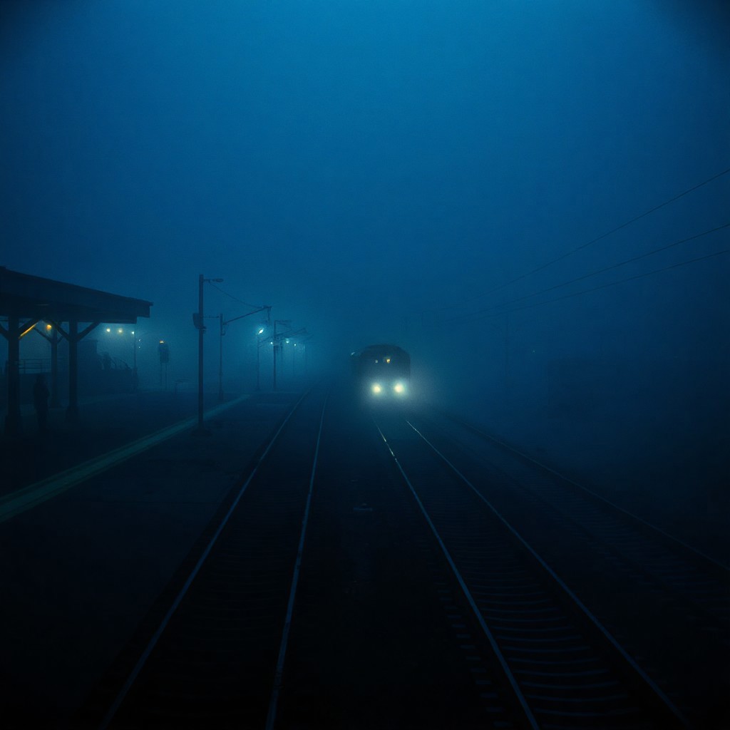 *"A still, hauntingly beautiful evening train station, bathed in deep blue hues and thick, slow-moving fog. The camera lingers motionless above the tracks, capturing the eerie stillness—only the faint glow of distant station lights piercing the mist. Suddenly, a slow, ghostly movement: a single train arrives silently, its headlights cutting through the fog like dim searchlights. The air shimmers with floating particles, and the scene feels frozen in time, yet alive with tension. No people, no loud sounds—just the quiet hum of machinery and the occasional creak of metal. Cinematic, 4K, 35mm film grain, muted colors, surreal and dreamlike."*