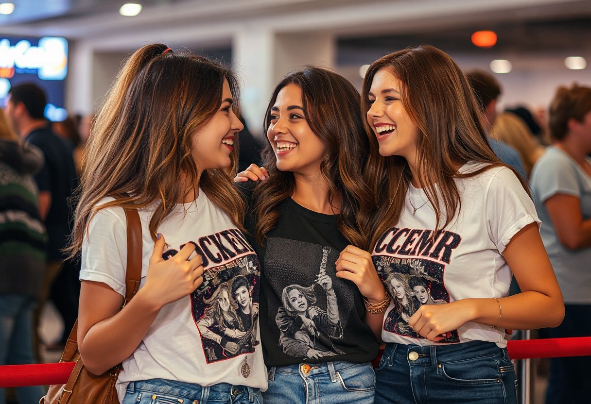 three beautiful women friends, 18yo, waiting impatiently in line for a famous female singer's rock concert, excited, wearing fan shirts, touching, holding, chatting, bodies in motion, mouths open, eyes glittering
