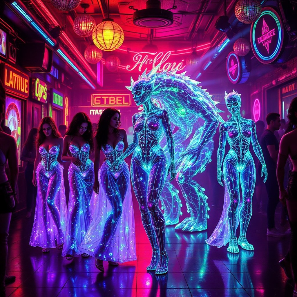 A vivid, cinematic strip club scene, illuminated by the pulsating neon lights that cast an ethereal glow on the bioluminescent patrons. In the center of this vibrant tableau, a stunning 32k masterpiece unfolds in a series of manga panels, each depicting a unique transformation sequence of five female Archaea and five male Kaiju. The females, with their translucent bodies revealing intricate bioluminescent veins, wear shimmering glass-like robes that seem to shatter and reassemble as they dance, each movement creating mesmerizing patterns of light. Their male counterparts, the protozoan Kaiju, stand tall and powerful, their bioluminescence glowing in stark contrast to their rugged, monstrous forms. The club is alive with the electric energy of 16k hyper-realistic, animated figures moving in the background, all sharing the same translucent, neon aesthetic.