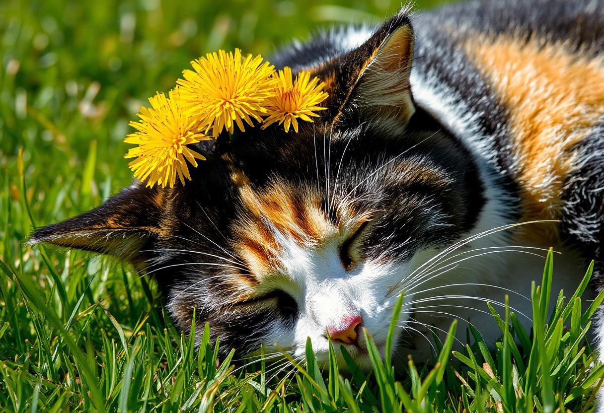 This is a high-quality, sharp photograph of a calico cat chilling on vibrant green grass. The cat, with its fur in a striking mix of black, orange, and white, is lounging in a semi-reclined pose with its head resting on the ground. Two bright yellow dandelions are perched on its head, adding a whimsical touch. The cat's eyes are closed, and its long whiskers are clearly visible, suggesting it's either basking in the sun or taking a snooze. The sunlight is natural, casting a soft, even light over the scene, with no harsh shadows. The photo was likely taken with a DSLR camera, possibly a Canon EOS 5D Mark IV, using a moderate aperture around f/4 to f/5.6, a shutter speed of about 1/250 seconds, and an ISO of around 200. The depth of field is shallow, keeping the cat in sharp focus while the background is softly blurred, emphasizing the subject. The composition uses the rule of thirds, with the cat's head and dandelions placed along the intersecting lines, adding to the image's pleasing balance. The aesthetic quality of the image is very high, capturing the serene and cute moment beautifully. This image is safe for work (SFW).
