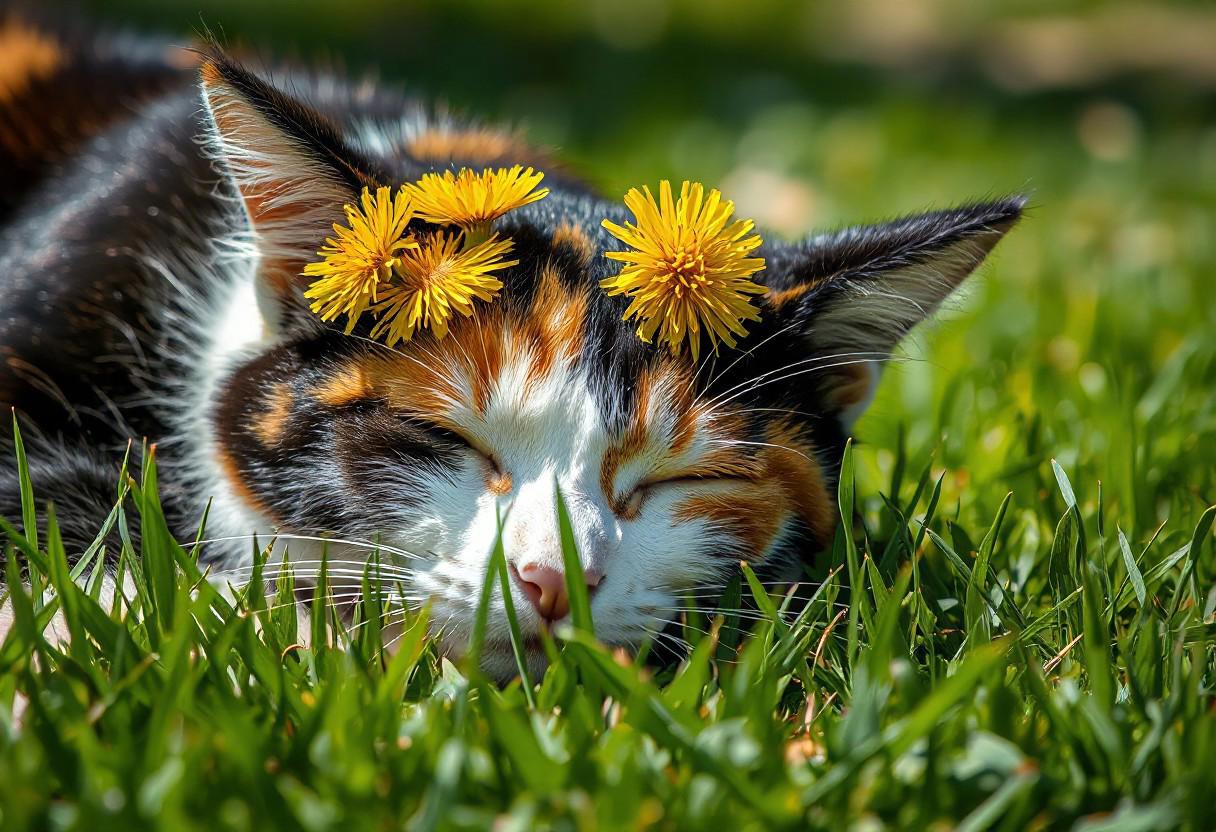 This is a high-quality, sharp photograph of a calico cat chilling on vibrant green grass. The cat, with its fur in a striking mix of black, orange, and white, is lounging in a semi-reclined pose with its head resting on the ground. Two bright yellow dandelions are perched on its head, adding a whimsical touch. The cat's eyes are closed, and its long whiskers are clearly visible, suggesting it's either basking in the sun or taking a snooze. The sunlight is natural, casting a soft, even light over the scene, with no harsh shadows. The photo was likely taken with a DSLR camera, possibly a Canon EOS 5D Mark IV, using a moderate aperture around f/4 to f/5.6, a shutter speed of about 1/250 seconds, and an ISO of around 200. The depth of field is shallow, keeping the cat in sharp focus while the background is softly blurred, emphasizing the subject. The composition uses the rule of thirds, with the cat's head and dandelions placed along the intersecting lines, adding to the image's pleasing balance. The aesthetic quality of the image is very high, capturing the serene and cute moment beautifully. This image is safe for work (SFW).