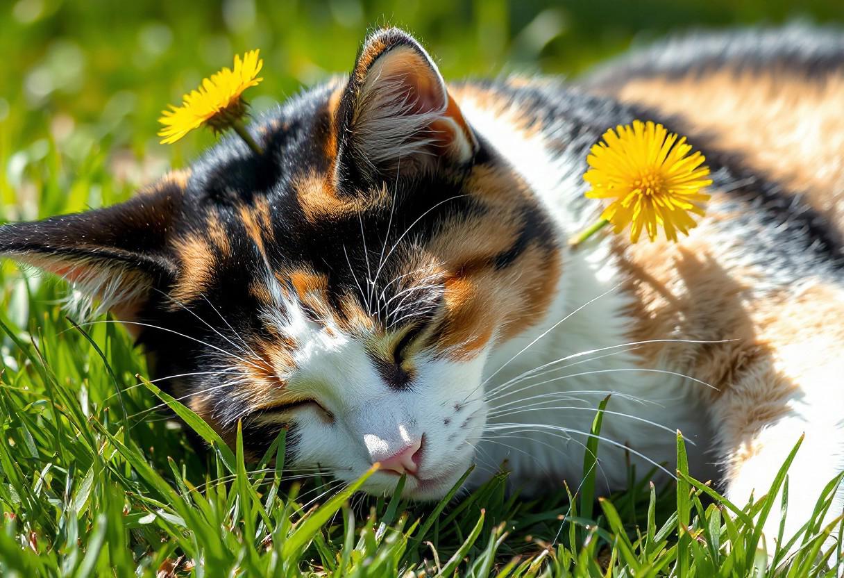 This is a high-quality, sharp photograph of a calico cat chilling on vibrant green grass. The cat, with its fur in a striking mix of black, orange, and white, is lounging in a semi-reclined pose with its head resting on the ground. Two bright yellow dandelions are perched on its head, adding a whimsical touch. The cat's eyes are closed, and its long whiskers are clearly visible, suggesting it's either basking in the sun or taking a snooze. The sunlight is natural, casting a soft, even light over the scene, with no harsh shadows. The photo was likely taken with a DSLR camera, possibly a Canon EOS 5D Mark IV, using a moderate aperture around f/4 to f/5.6, a shutter speed of about 1/250 seconds, and an ISO of around 200. The depth of field is shallow, keeping the cat in sharp focus while the background is softly blurred, emphasizing the subject. The composition uses the rule of thirds, with the cat's head and dandelions placed along the intersecting lines, adding to the image's pleasing balance. The aesthetic quality of the image is very high, capturing the serene and cute moment beautifully. This image is safe for work (SFW).