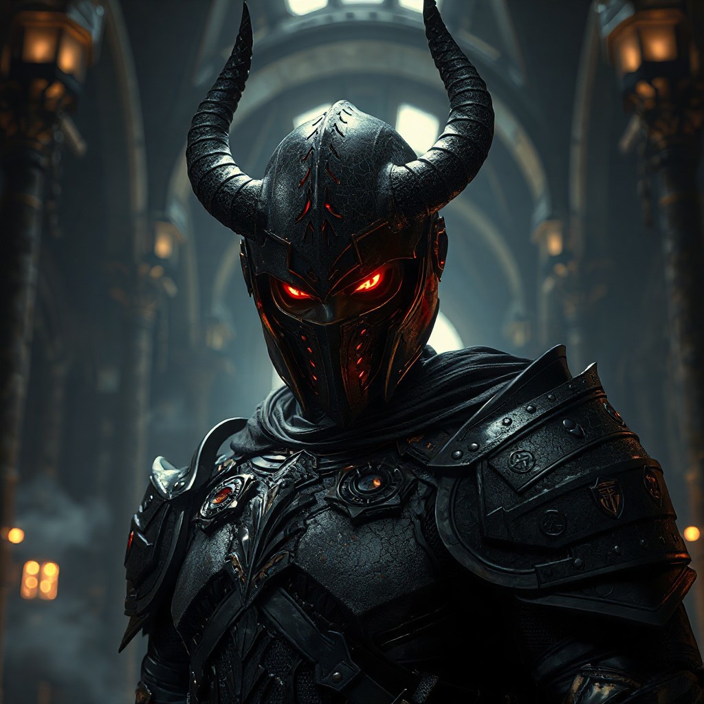 "A cinematic portrait of Ventdra, the Empowered Warrior: towering armored figure with a horned helmet (carbon fiber with etched runes), glowing crimson eyes with particle effects, and battle-scarred obsidian armor. Set in the Curse of the Shadow Prison—a dimly lit gothic hall with blurred gothic arches, crumbling stone pillars, and chains dangling from ceilings. Dramatic chiaroscuro lighting highlights Ventdra’s silhouette, casting long shadows. Hyper-detailed textures: cracked armor plating, glowing eye circuitry, and matte-black leather straps. Stylized with Dark Souls ambiance and Alphonse Mucha’s art nouveau flourishes—flowing cape patterns, gold filigree. Rendered in Unreal Engine 5 realism, Octane Render gloss, and Dutch angle composition. Color palette: midnight blacks, blood red accents, and ethereal gold highlights. Background features faint glowing glyphs and spectral mist. Trending on ArtStation, 8K HDR, golden ratio framing, cinematic depth-of-field. Tags: dark fantasy warrior, menacing aura, hyperrealistic armor, volumetric fog, flickering torchlight."