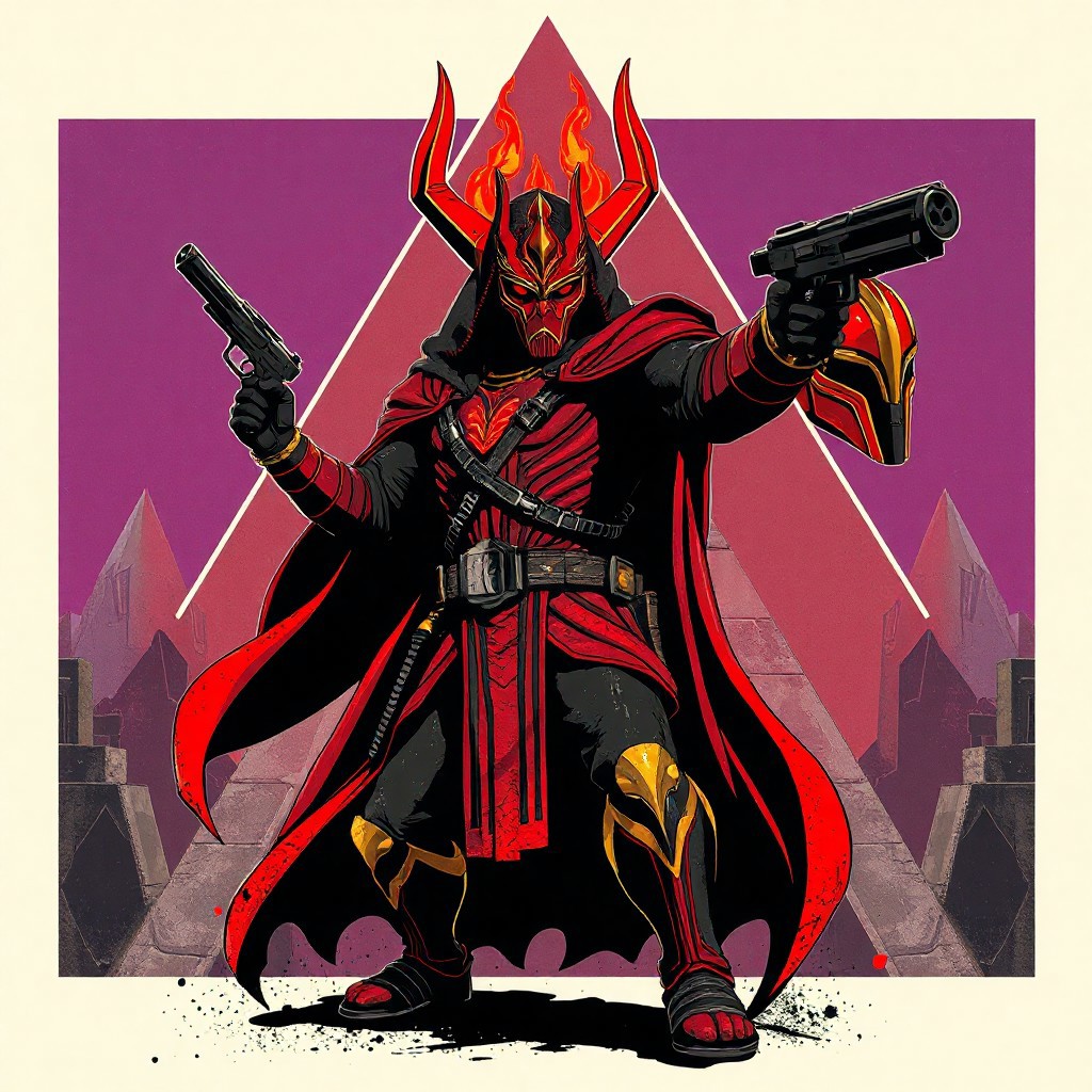 "A vintage Star Wars poster-style Horus the Black Flame Deity, anthro figure in dynamic action pose: blaster in right hand, red-black-gold helmet in left. Bold retro comic outlines, halftone textures, splatter effects, and stark Triamid Fortress geometric background. Color scheme: fiery red, matte black, gold accents, violet undertones. Stylized with Ralph McQuarrie-inspired concept art, retro-futuristic detailing, and dramatic shadows. Hyper-realistic textures, cinematic Unreal Engine 5 lighting, Octane Render gloss. Matte painting composition, trending on ArtStation, 8k HDR, golden ratio framing, isometric angle. Exaggerated proportions, vivid emotions, powerful stance. Retro-futuristic blend of 1970s sci-fi aesthetics and modern hyper-detailed CGI."