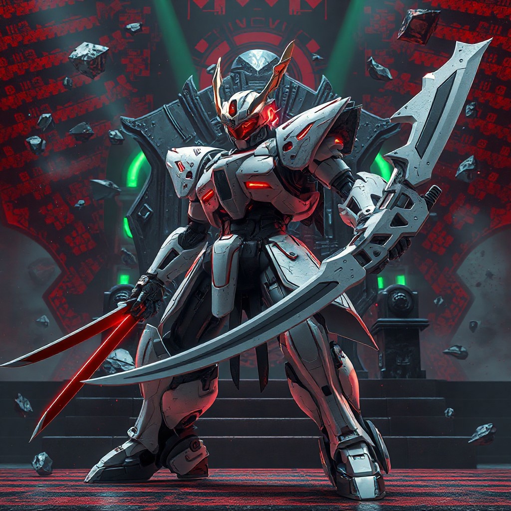 "A futuristic Superheavy Samurai Magnet robot in a dynamic battle stance, white-and-gray armored body with glossy metallic textures, dual katanas (large on right arm, smaller on left), and a crimson visor glowing with energy. Against a Nightmare Throne backdrop of red-black checkered patterns and floating geometric debris, evoking a surreal cyberpunk arena. Stylized with sharp mecha design, Octane Render gloss, and Unreal Engine 5 realism. Hyper-detailed surfaces: scratched armor, neon circuit lines, and plasma energy radiating from blades. Cinematic lighting—dramatic shadows and volumetric beams—accentuates the samurai’s poised stance and the throne’s ominous depth. Color palette: monochrome steel with red accents, juxtaposed against acidic green glows in the background. Influenced by Ghost in the Shell mecha aesthetics and Katsuhiro Otomo’s industrial art. Trending on ArtStation, 8K HDR, golden ratio framing, Dutch angle composition. Matte painting layers blend 3D CGI and traditional ink splatter effects for raw intensity.