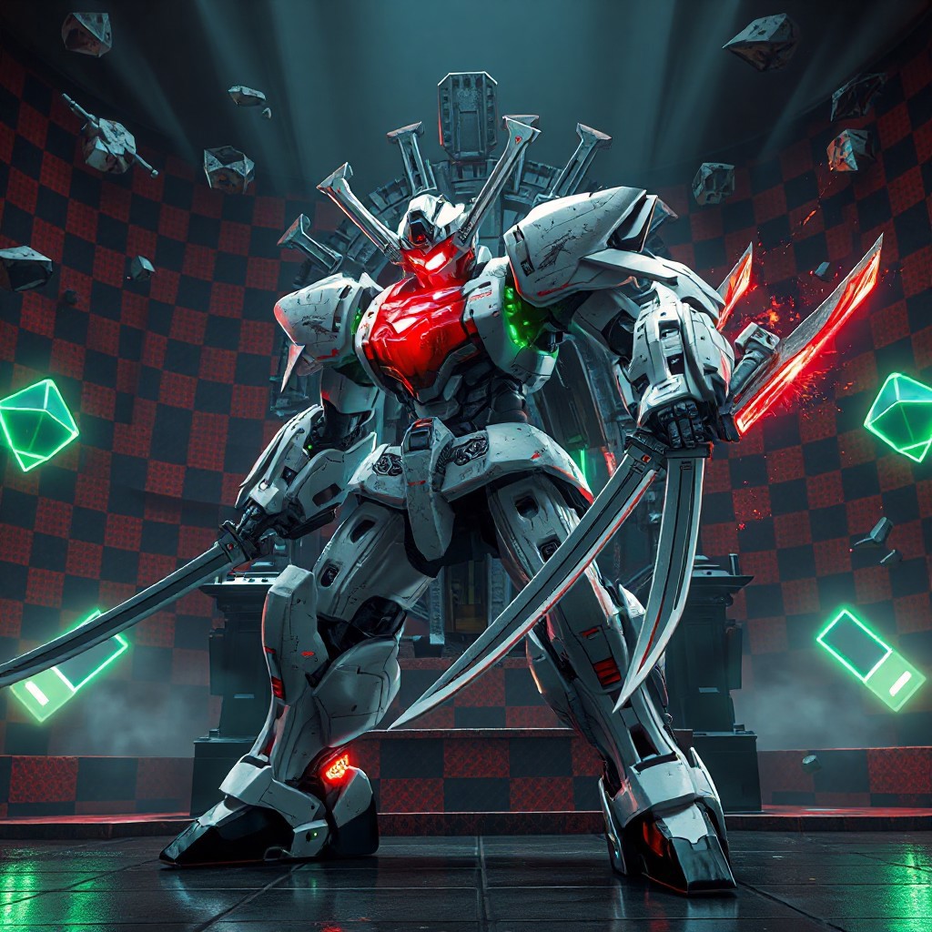 "A futuristic Superheavy Samurai Magnet robot in a dynamic battle stance, white-and-gray armored body with glossy metallic textures, dual katanas (large on right arm, smaller on left), and a crimson visor glowing with energy. Against a Nightmare Throne backdrop of red-black checkered patterns and floating geometric debris, evoking a surreal cyberpunk arena. Stylized with sharp mecha design, Octane Render gloss, and Unreal Engine 5 realism. Hyper-detailed surfaces: scratched armor, neon circuit lines, and plasma energy radiating from blades. Cinematic lighting—dramatic shadows and volumetric beams—accentuates the samurai’s poised stance and the throne’s ominous depth. Color palette: monochrome steel with red accents, juxtaposed against acidic green glows in the background. Influenced by Ghost in the Shell mecha aesthetics and Katsuhiro Otomo’s industrial art. Trending on ArtStation, 8K HDR, golden ratio framing, Dutch angle composition. Matte painting layers blend 3D CGI and traditional ink splatter effects for raw intensity.