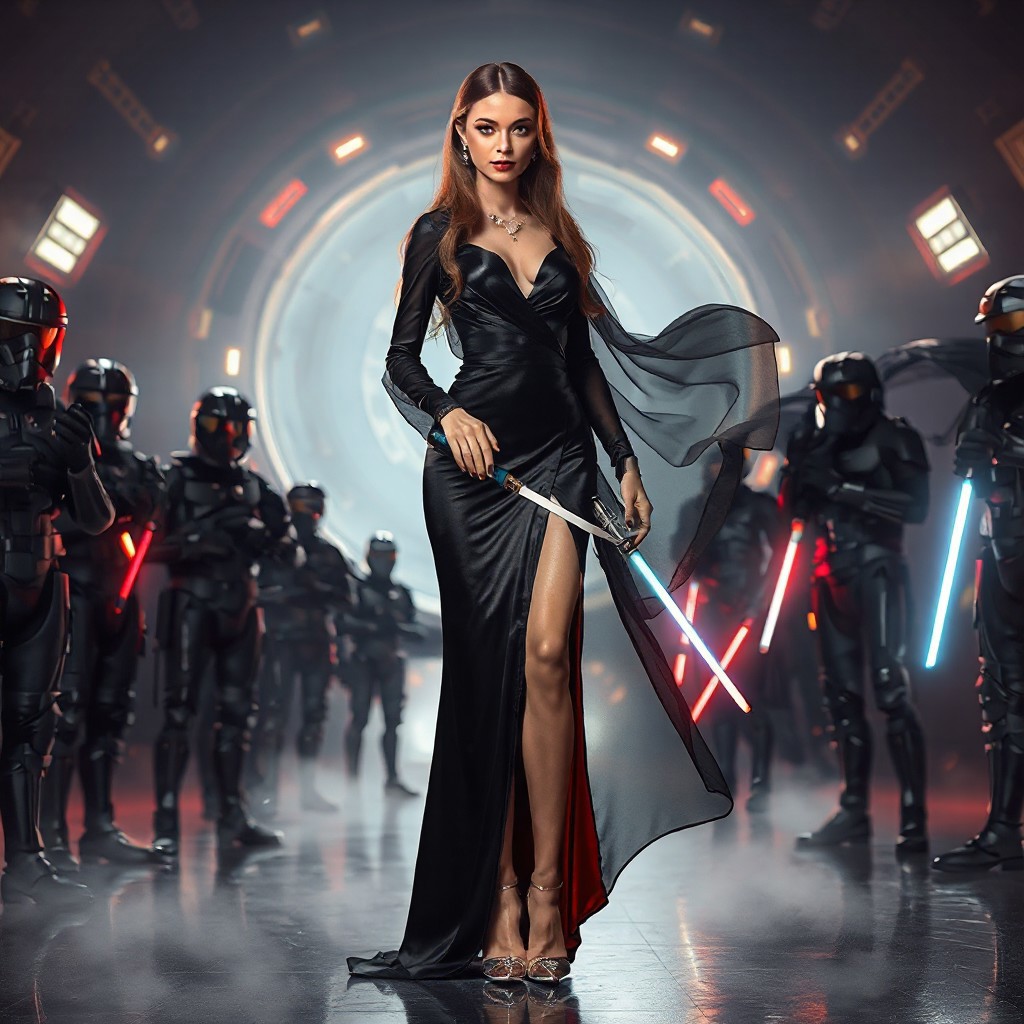 slender arrogant cold femme fatal russian princess wearing black glossy satin high slit gown with red lining, small size opulent glossy high heels, ultrathin black transparent slime cloak, jewels, elegant small light saber, posing standing, evil grin, green eyes, lipstick, giant portal to outer space, fog from the floor, empire spaceship hangar, surrounded by halo odst troopers, TIE spaceships at the background, fashion look, hollywood, vogue makeup, porcelain skin, long haired, ultrathin waisym reminiscent of Lucas, Spielberg styles, with close-up glamour photography, glossy satin and silver heels glistening, fleshy slime dripping, and dark shadows.