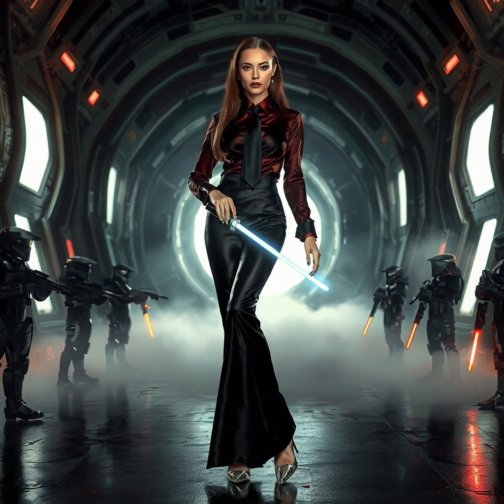 slender arrogant cold femme fatal lady wearing rich luxurious black glossy satin trouser suite, small size opulent glossy high heels, wine red shirt, black silk tie, jewels, elegant small light saber, posing standing, giant portal to outer space, fog from the floor, empire spaceship hangar, surrounded by halo odst troopers, fashion look, hollywood, vogue makeup, porcelain skin, long haired, ultrathin waisym reminiscent of H.R. Giger, Zdzisław Beksinski, and Ash Thorp's dark, sleek styles, with close-up glamour photography, glossy satin and silver heels glistening, fleshy slime dripping, and dark shadows.