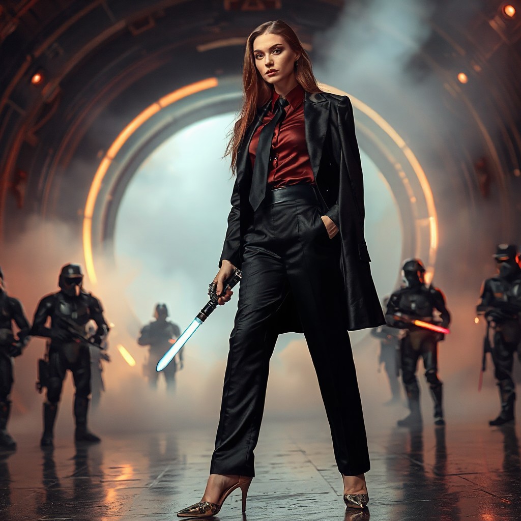 slender arrogant cold femme fatal lady wearing rich luxurious black glossy satin trouser suite, small size opulent glossy high heels, wine red shirt, black silk tie, jewels, elegant small light saber, posing standing, giant portal to outer space, fog from the floor, empire spaceship hangar, surrounded by halo odst troopers, fashion look, hollywood, vogue makeup, porcelain skin, long haired, ultrathin waisym reminiscent of H.R. Giger, Zdzisław Beksinski, and Ash Thorp's dark, sleek styles, with close-up glamour photography, glossy satin and silver heels glistening, fleshy slime dripping, and dark shadows.