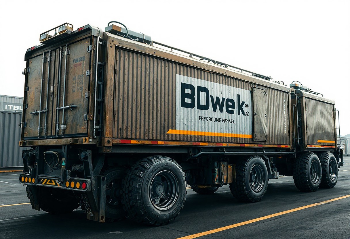 1 vehicle, cyberpunk industrial trailer. large wheels. Cargo containers on wheels. Logo label "BDwerks®" written on the side View from above.