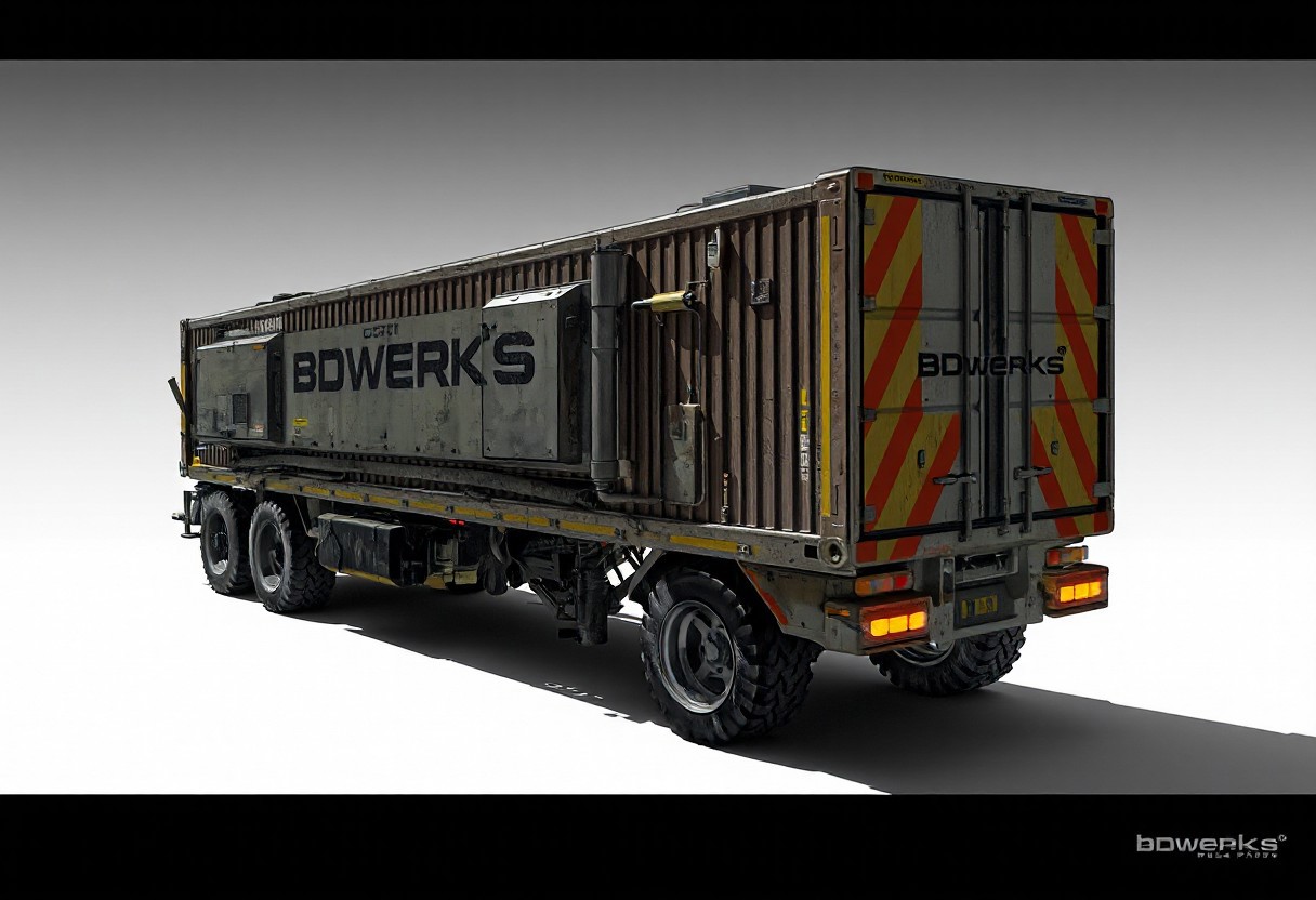 1 vehicle, cyberpunk industrial trailer. large wheels. Cargo containers on wheels. Logo label "BDwerks®" written on the side View from above.