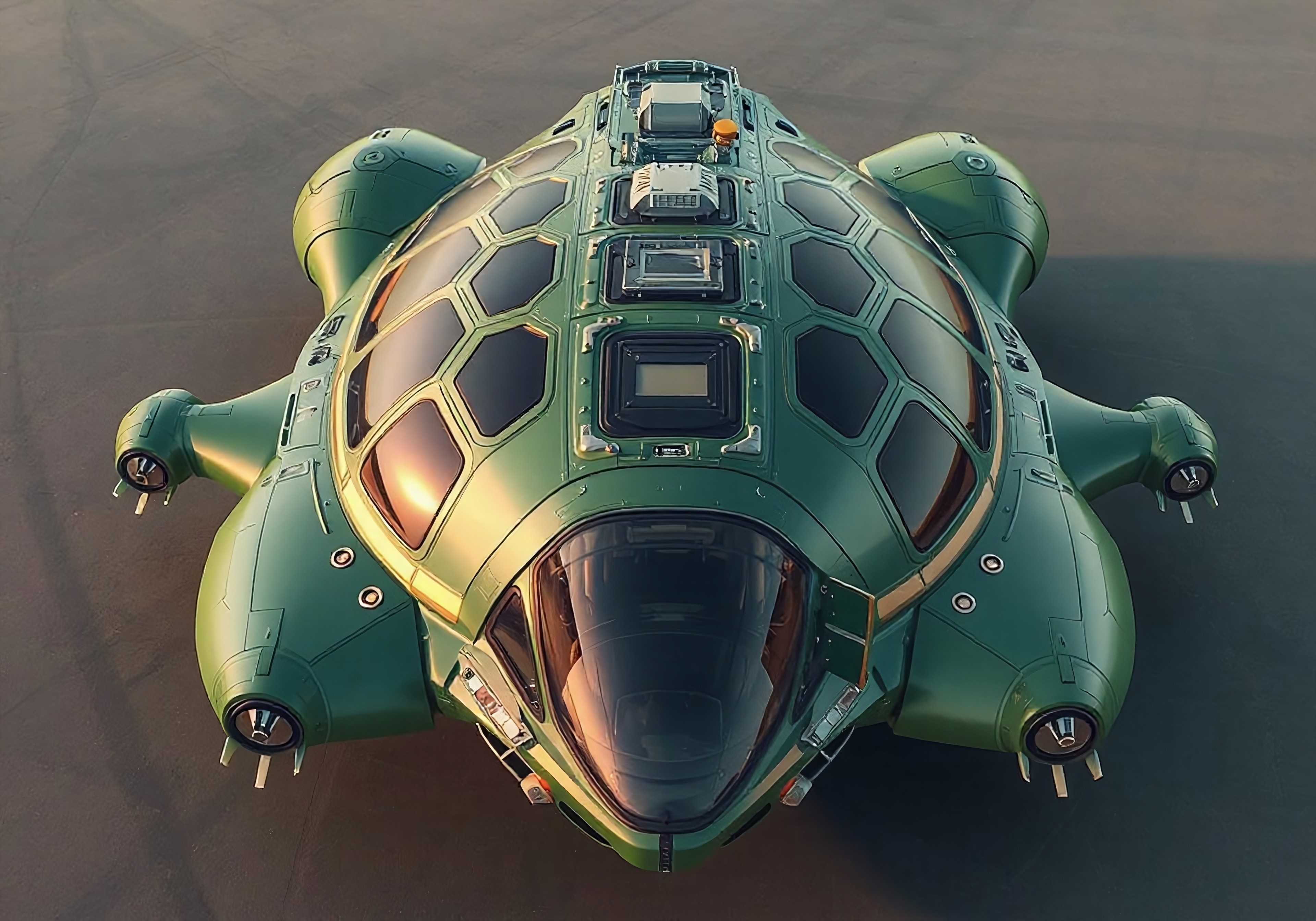 1 vehicle, very large hover RV shaped like a turtle doors and garage entrance with a large cockpit at the front. hover jets at each corner of the RV. Green and gold in color. View from above. 8k,
