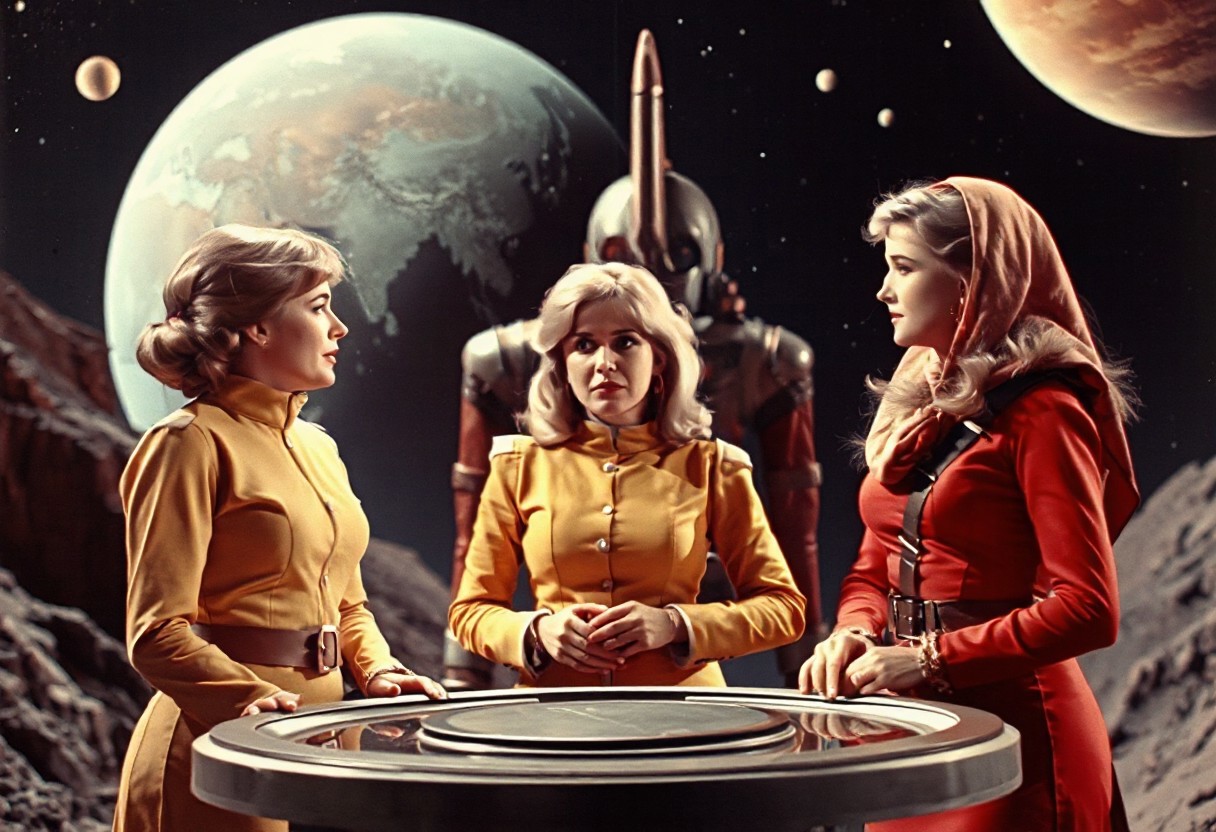 cinematic photograph, three women astro-explorers meeting the leaders of Planet Zebulon ,1960s adventure b-movie science fiction film, technicolor,