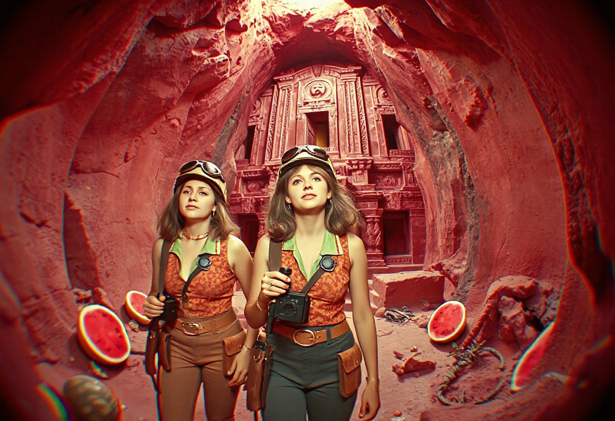 Viewmaster 3d cinematic photograph, three women astro-explorers , exploring a vast underground lost scared watermelon temple ,1960s adventure b-movie science fiction film, technicolor,