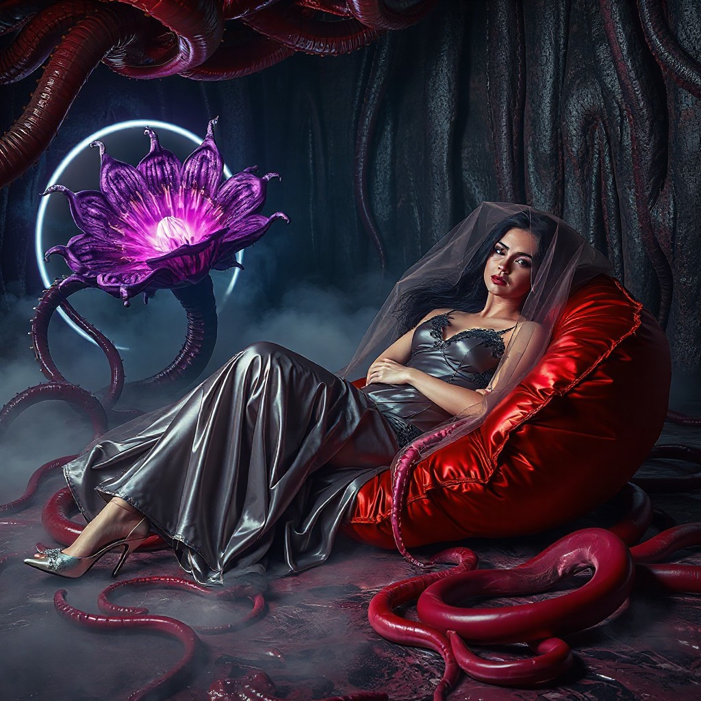 classy rich slender elegant russian baroness in glossy liquid satin provocative rich 1950s nightgown with lace inserts and glossy high heels, entangled in long tentacles, laying reclined in weird red foil pillows, covered with giant ultrathin transparent glossy slime veils, under tantacles canopy, giant portal to outer space, fog from the floor, giant purple alien carnivorous flower with glossy spiked petals at background, weird alien hive slime walls and fleshy floor, horror, fashion look, hollywood, vogue makeup, long haired, ultrathin waisym reminiscent of H.R. Giger, Zdzisław Beksinski, and Ash Thorp's dark, sleek styles, with close-up glamour photography, glossy satin and silver heels glistening, fleshy slime dripping, and dark shadows.
