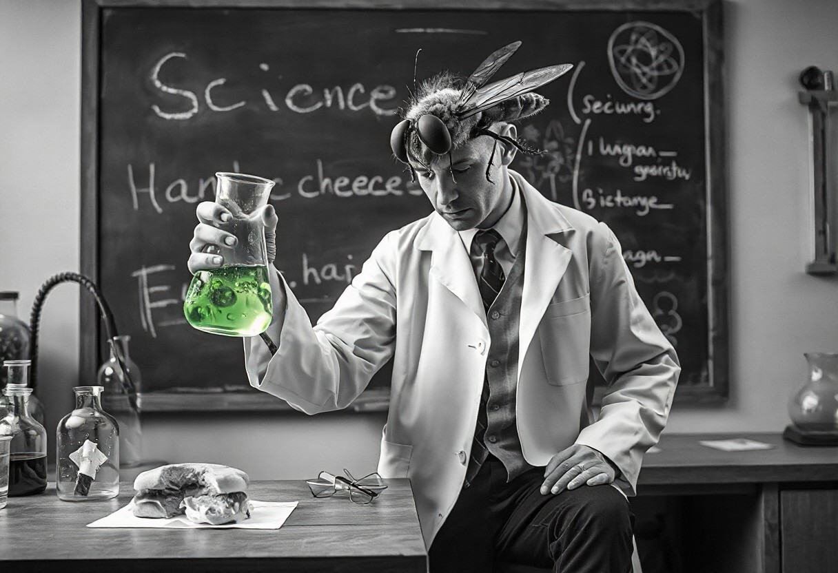 A mad scientist man is turning into a fly. The picture is in black and white. He is inside a laboratory. The man is holding a beaker with green bubbles in it.the man is wearing a lab coat and black slacks. There is a chalkboard behind him with science written on it. The scientists head is half fly half man. He has a half eaten ham and cheese sandwich on the table next to him.