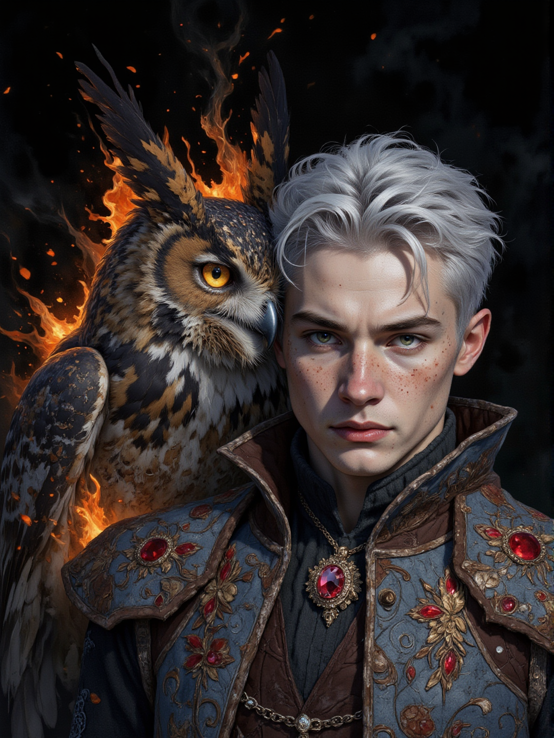 A fierce young man with cold gray hair and black eyes stands beside a majestic owl. His freckled skin glows in the cold light of the frost that dance around them. He wears an ornate gray and red embroidered vest adorned with intricate fire patterns, a matching pendant with an ruby gemstone resting at his throat. His expression is intense, determined, and regal. The owl, its feathers a radiant blend of gray and brown, presses close to him, its sharp beak and piercing eyes exuding power and wisdom. fire ash float in the air, casting an ethereal glow against the dark background, as if the world itself bends to their presence.