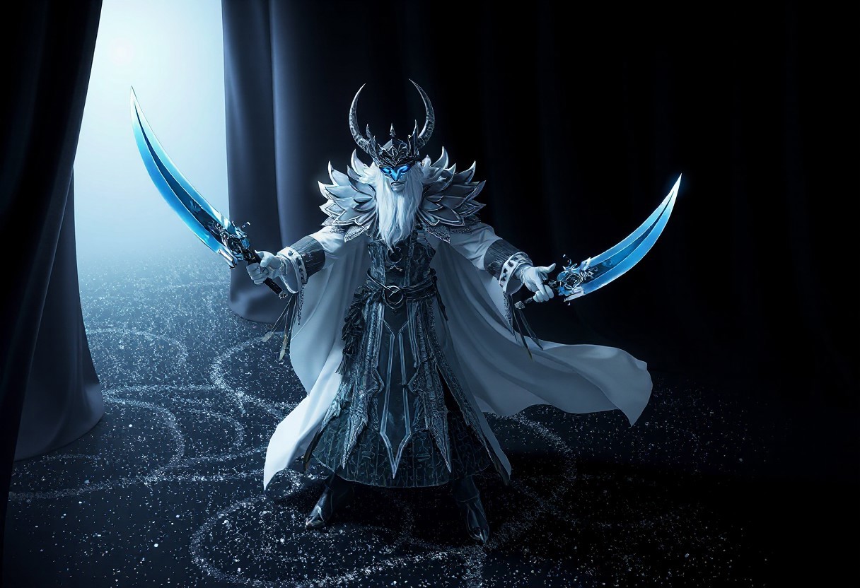 "Depict a Mad King of the Dark World, in a detailed 4K image, wielding Butterfly Daggers - Elma on each arm. The King, predominantly white and gray, stands on a Dark Magic Curtain, transitioning from dark to light. The backdrop is scattered with small white dots, giving a sense of depth. Adorned with a blue visor, the King is ready for action. Use vibrant colors, contrast, sharp lines, and finely detailed textures to highlight the isometric illustration. Achieve photorealistic imagery using unreal engine, octane render, or 8k post-processing. Ensure a harmonious color scheme and dynamic action pose. Submit to artstation for trending consideration."