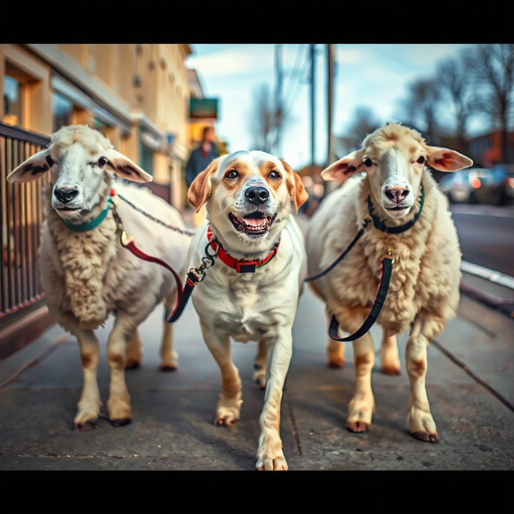 lovely dog leading three sheep by leashes attached to their necks, dog holds leashes in his mouth, on city sidewalk