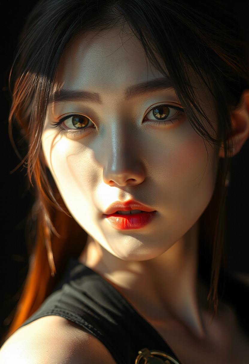 DSLR-style portrait of a slender, elegant 26-year-old Korean model, translucent pale skin with natural texture, soft shadow on cheek, diffused daylight from side, parted lips, clean background, solo, masterpiece, ultra high-res <lora:NOOB_vp1_detailer_by_volnovik_v1:1> barely visible pores, subtle skin texture variation, translucent skin tone score_9, score_8_up, score_7_up, black hair, shiny skin, wet skin, eye contact, tilted angle, moody lighting, flouting, suggestive pose, perfect quality, (abstract:0.2) <lora:MythAnim3Style:0.9> MythAn1m3, , asian face, (Korean)(black eyes) (masterpiece:1.4), (best quality:1.2) <lora:RMSDXL_Enhance: 0@0, 4@5 > <lora:Add_more_details_pony: 0@0, 1@5 > <lora:hd_4k_ntc: 0@0, 1@5 > (Depth of field), masterpiece, high resolution, cinematic, masterpiece, (bright lighting), <lora:S1_Dramatic_Lighting_v2:0.15> <lora:g4n1m3XLP:0.8> <lora:d3t41l3dXLP:0.5> ,gorgeous:4,detailed <lora:surrealidescent_v1:3.14> <lora:flux dtmh:3.14> <lora:Hand v2:3.14>, SEED: 611294289, cleavage, cameltoe, score_9, score_8_up, score_7_up, source_anime, ((solo)), calm, closed mouth, 1girl, solo, (huge breasts, thin waist, wide hips), peaceful, closed mouth, ((fujimaru_ritsuka)), orange hair, yellow eyes, above_medium hair, bangs, hair between eyes, ahoge, black_knight clothing, ((knight helmet)), metal armor, pauldrons, gauntlets, chestplate, armored skirt, black leggings, black skirt, black background,